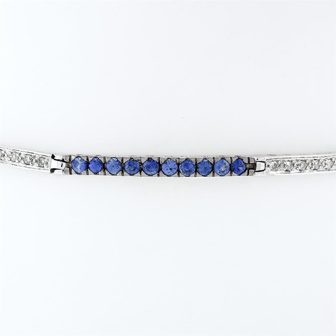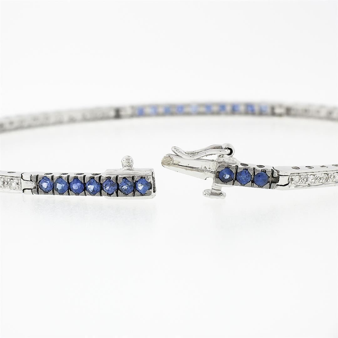 A solid 18k white gold with blackended gold prongs tennis line bracelet, with 44 round brilliant cut natural diamonds (G/H- SI1/SI2; 0.44ctw), & 40 round brilliant cut natural sapphires (1.00ctw). It weighs a total of 7.16 grams, measures 2.40mm wide, and measures 7 inches in length.