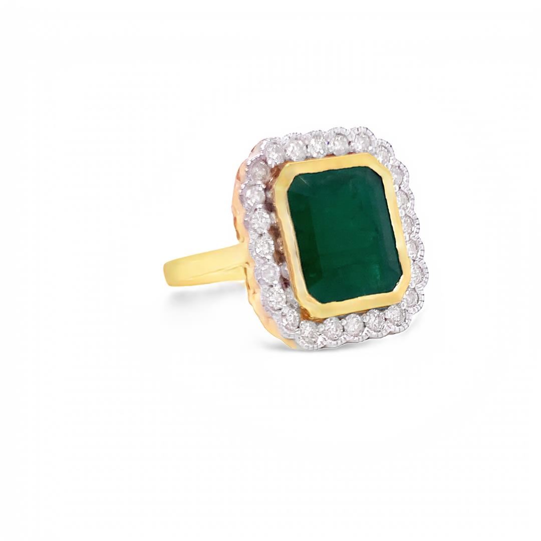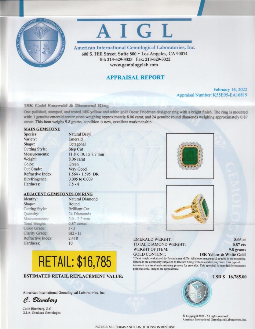 18K Emerald Ring 8.06ct. Please see Photos and Description for all available information. This elegant emerald ring shows the purity and brilliance of an emerald cut beryl. The 8.06ct emerald beryl is set on a pave setting and surrounded by sparkling round diamonds. This ring is made of 18K gold.
