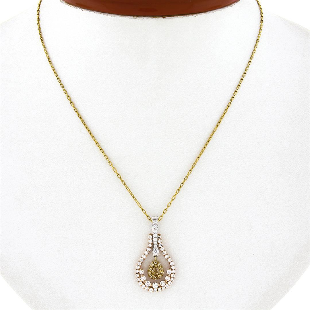 A solid 18k yellow, rose & White gold pendant necklace, with 1 pear cut natural brown diamond (VS2 - 0.20ctw), and 10 round brilliant cut natural yellow diamonds (VS2 - 0.20ctw), and 49 round brilliant cut natural diamonds (G/H - VS1/VS2 ; 0.80ctw). 18 inch cable link chain, 4.51 grams total weight, pendant measures 27.40x14.50mm.