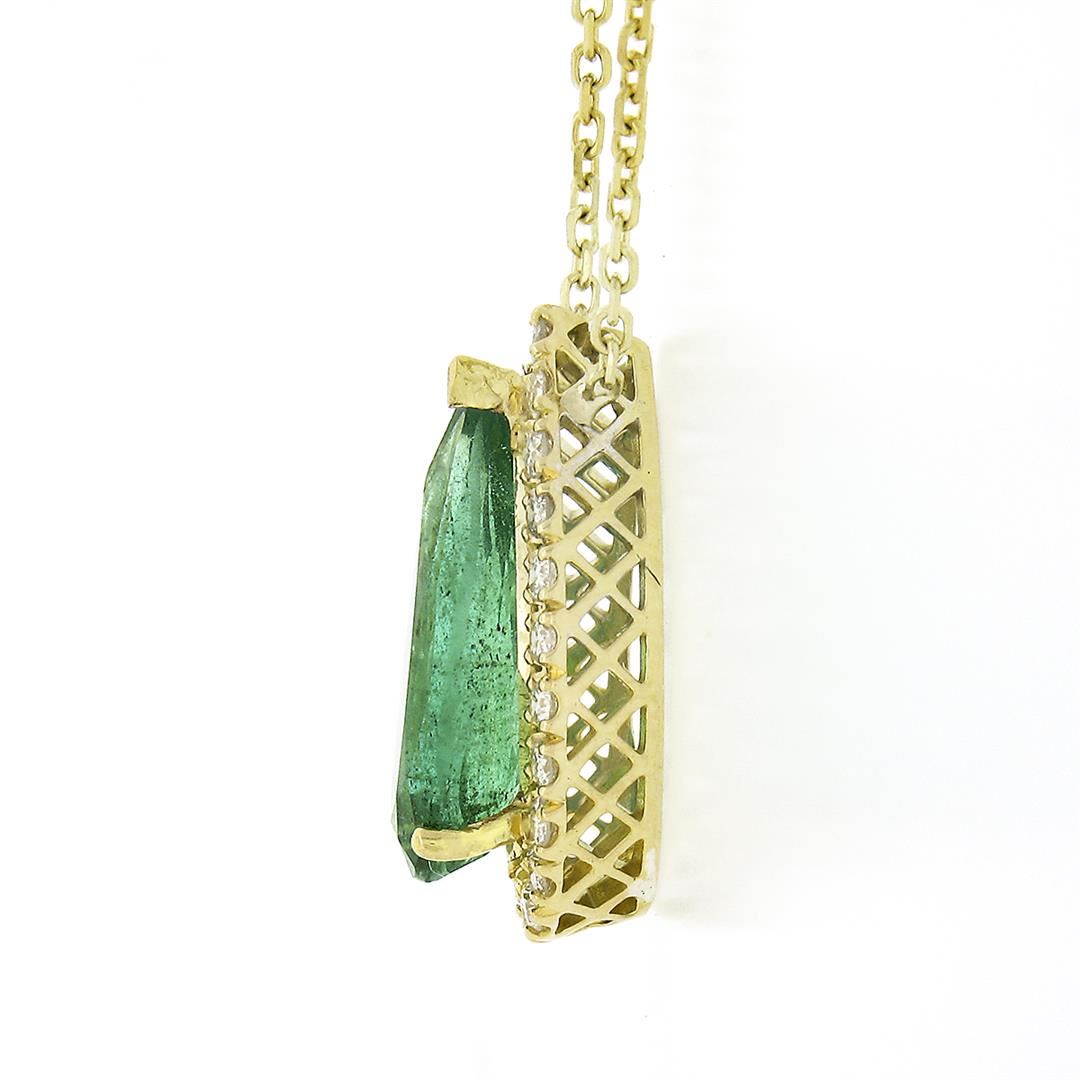 A solid 18k yellow gold terdrop pendant necklace, with 1 pear cut natural emerald (13x5.7mm - 1.85ct), surrounded with a halo of 22 round brilliant cut natural diamonds (G/H - VS2/SI2 ; 0.30ctw). The pendant weighs a total of 3.48 grams, measures 16.75x8.