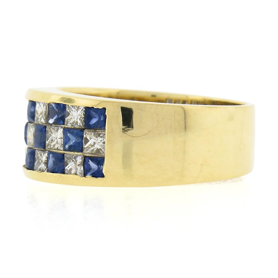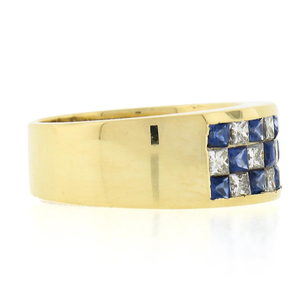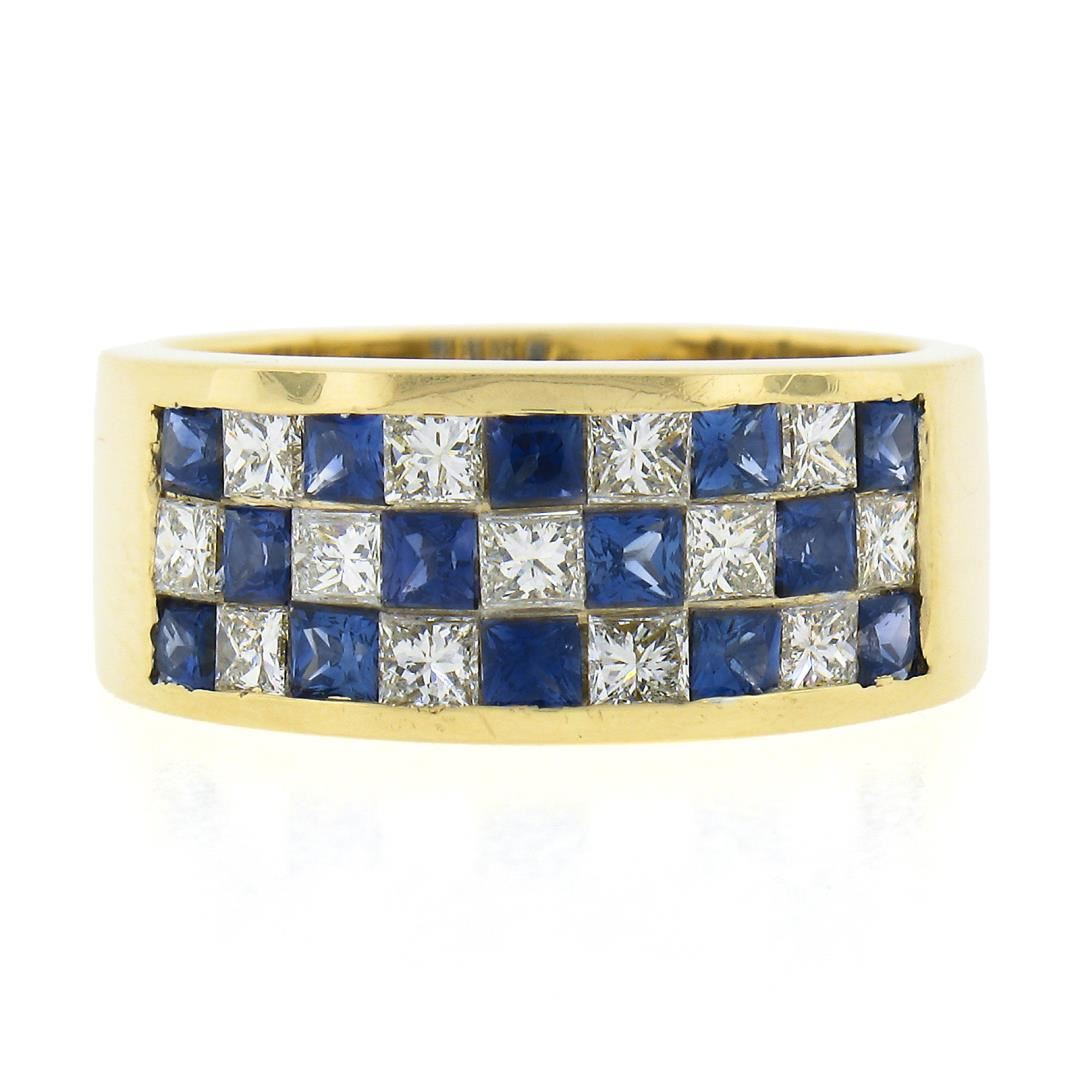 A solid 18k yellow gold wide band ring, with 14 square cut natural sapphires (1.12ctw), and 10 square cut natural diamonds (I/J - VS1/VS2 ; 1.04ctw). The ring is size 7.0, weighs a total of 9.32 grams, and measures 8.3mm wide.