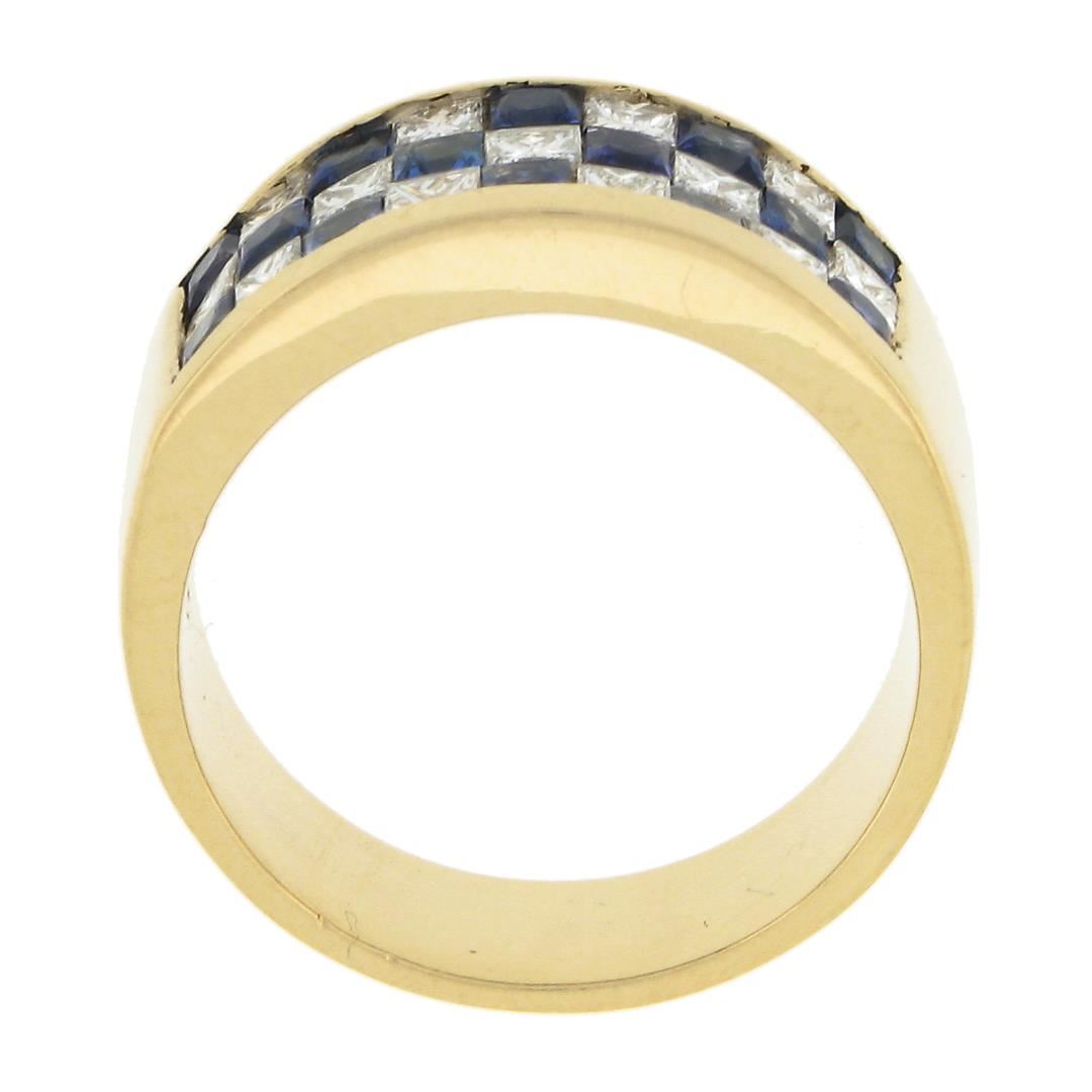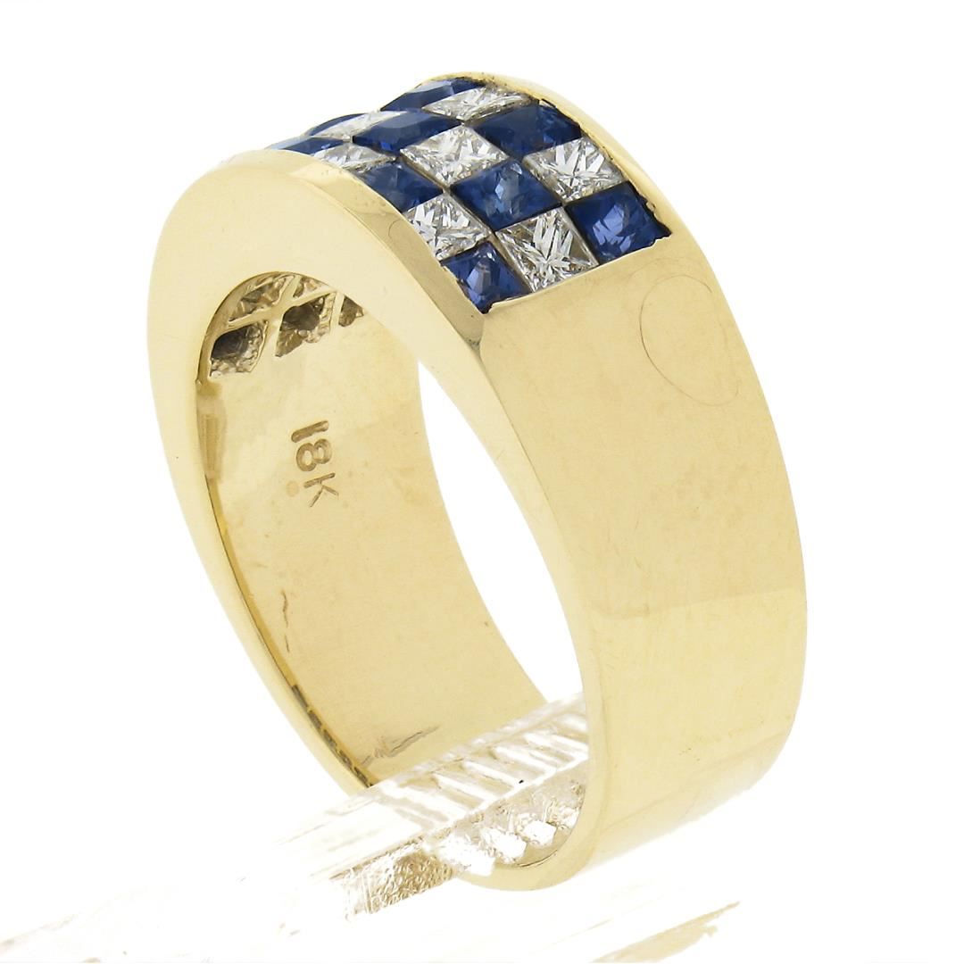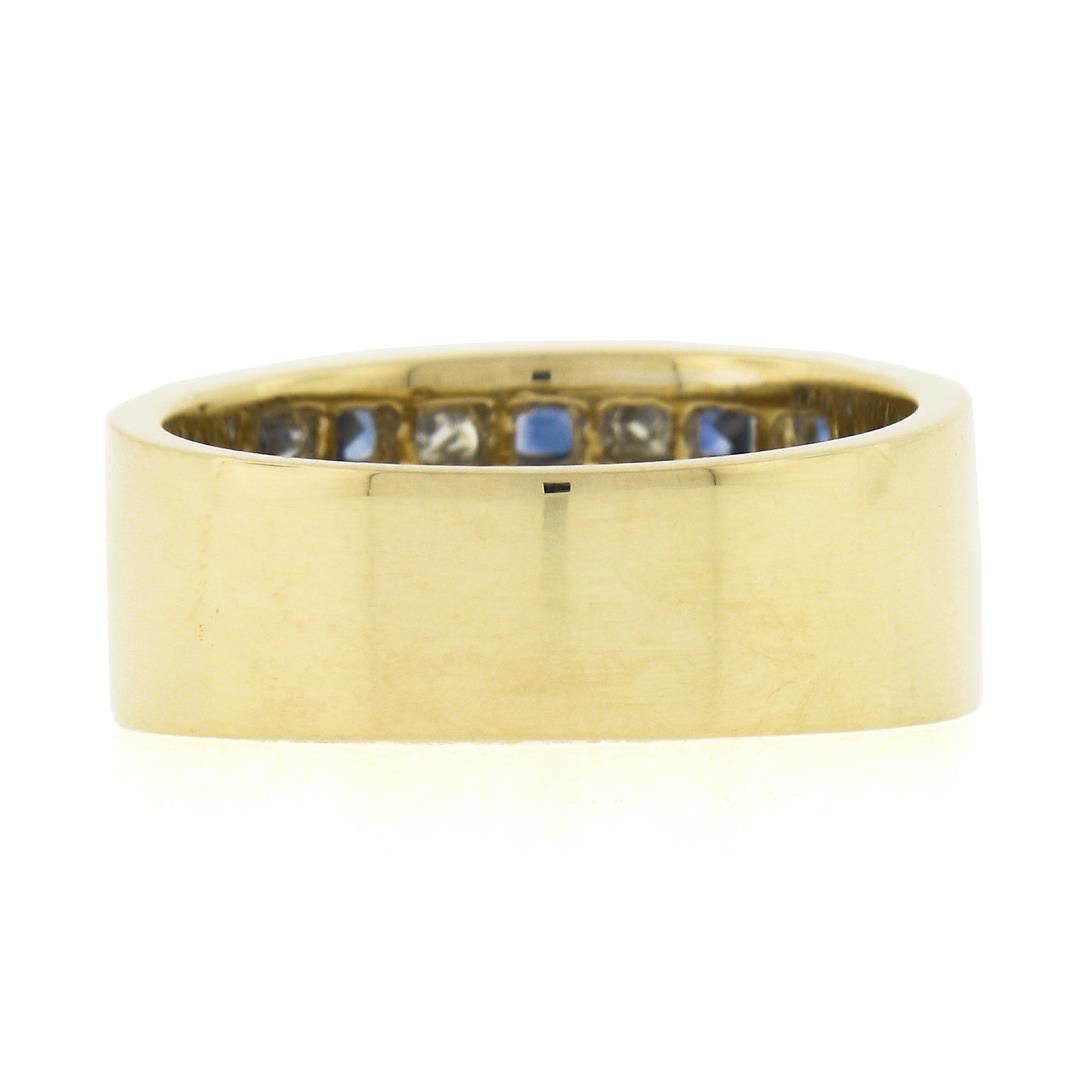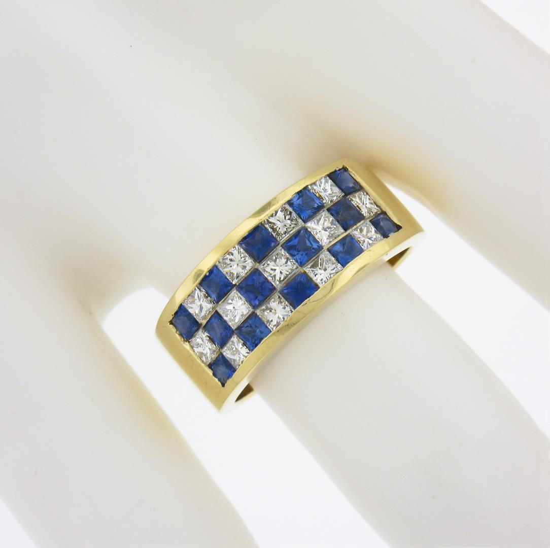 A solid 18k yellow gold wide band ring, with 14 square cut natural sapphires (1.12ctw), and 10 square cut natural diamonds (I/J - VS1/VS2 ; 1.04ctw). The ring is size 7.0, weighs a total of 9.32 grams, and measures 8.3mm wide.