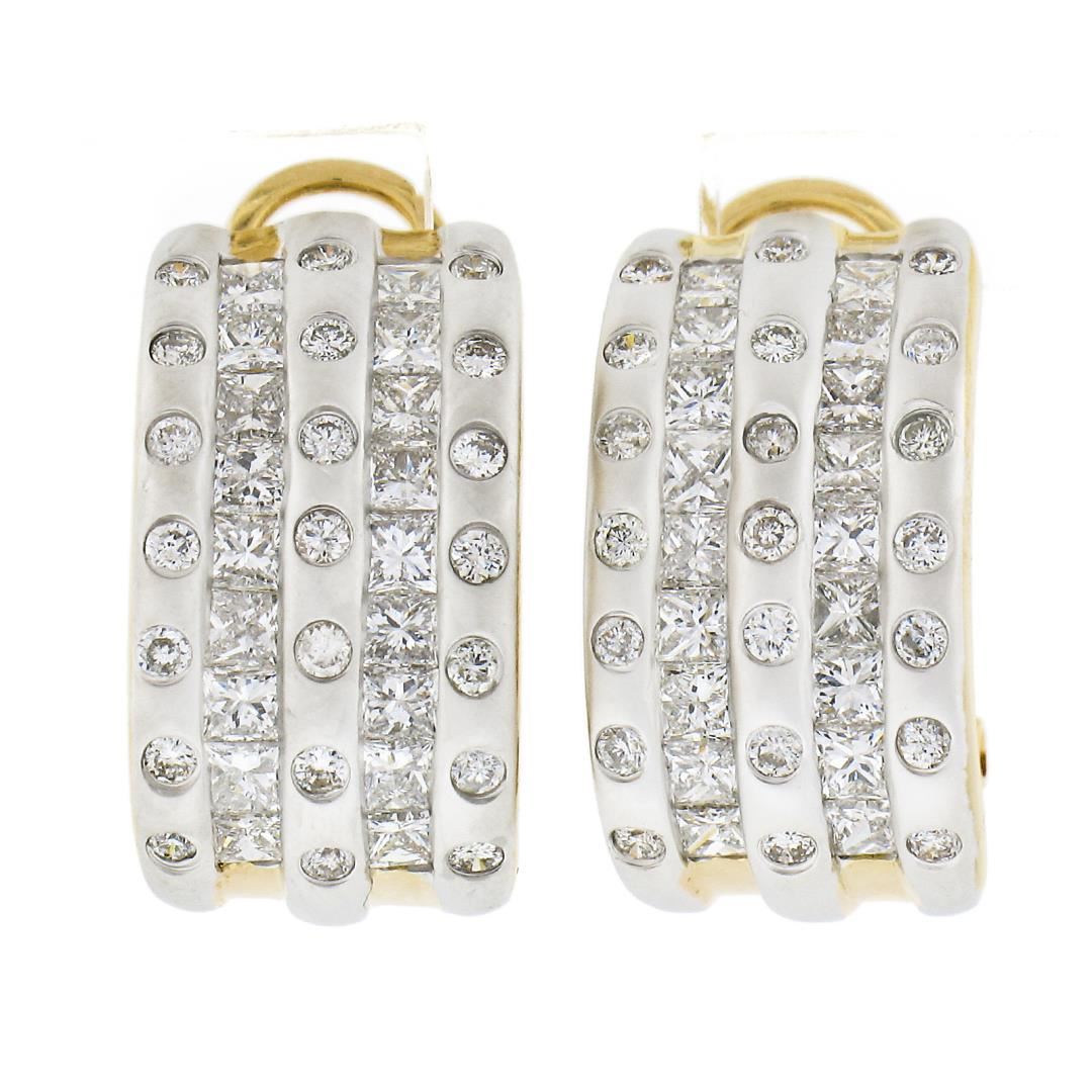 A solid 18k white & yellow gold earrings, with 36 princess cut natural diamonds (G/H - VS1/VS2 & a few SI1 ; 1.70ctw), and 42 round cut natural diamonds (G-I - SI1/SI2 ; 0.60ctw). The earrings measure approximately 19x10.2mm and weigh a total of 9.29 grams.
