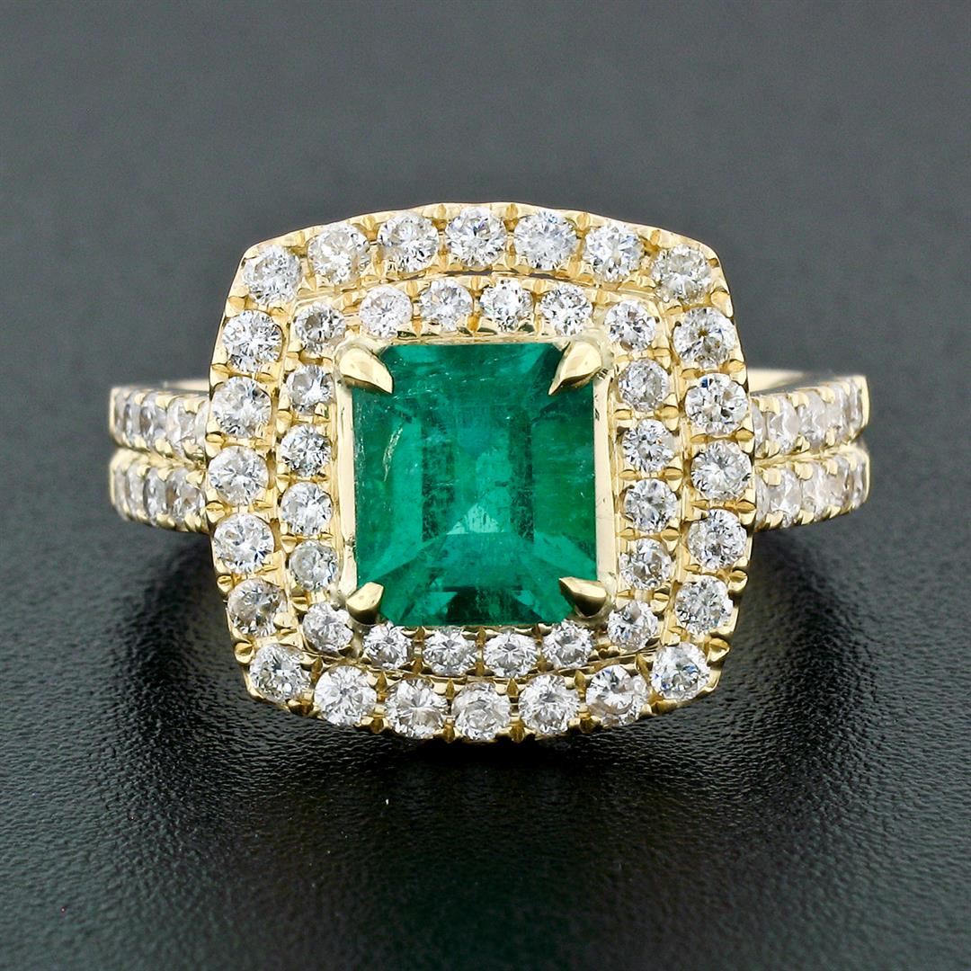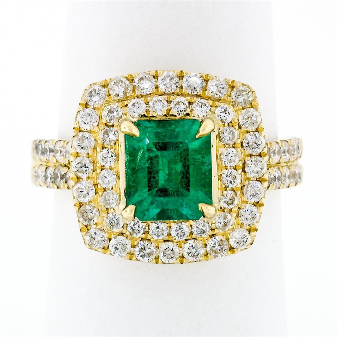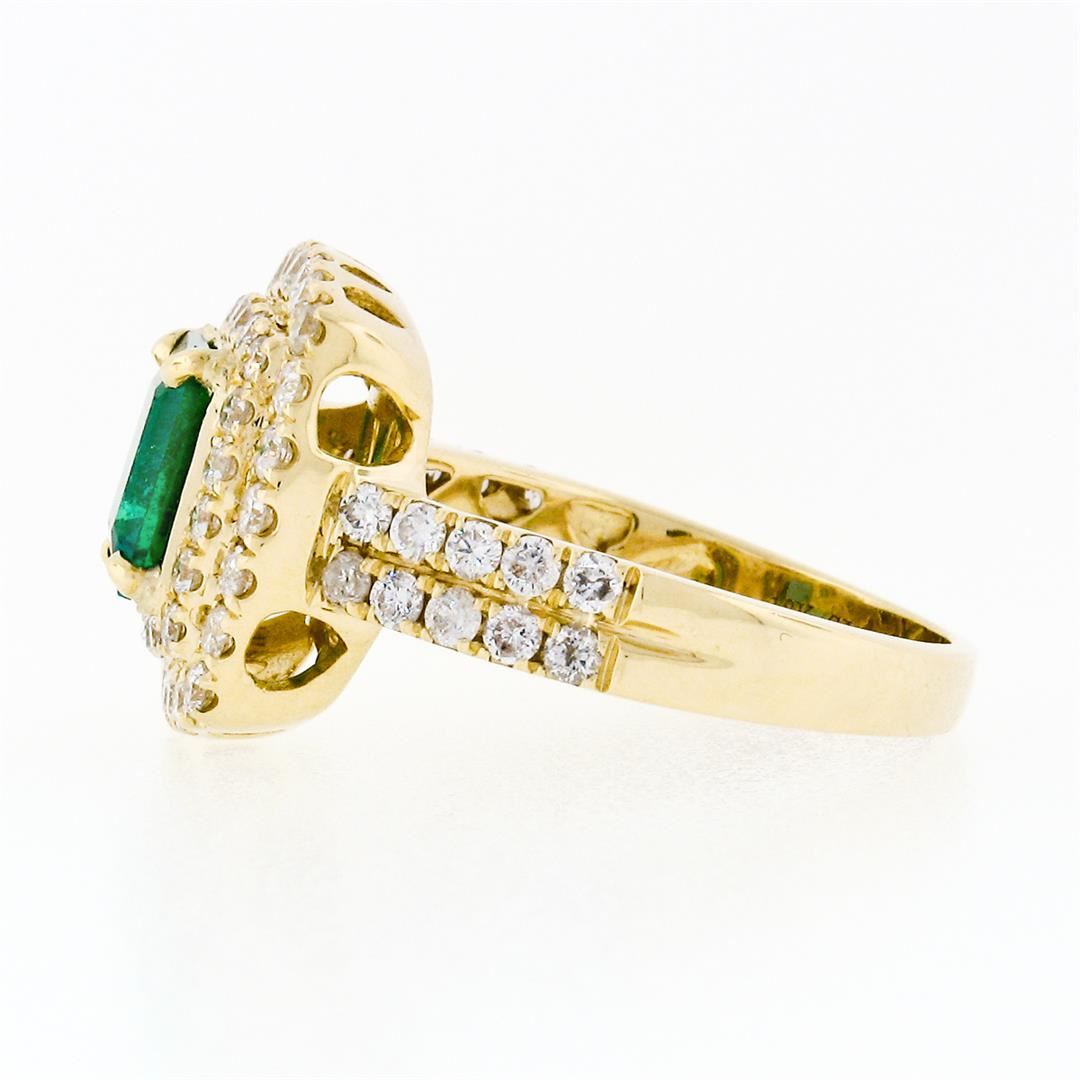 An Estate solid 18k yellow gold engagement ring, featuring 1 Gia certified octagonal step cut natural emerlad, surrounded with a halo of 64 round brilliant cut natural diamonds (F/G - VS2/SI1 ; 1.40ctw). The ring is size 7, weighs a total of 6.40 grams, and measures 14.45mm wide. Comes with all original relevant certifications.