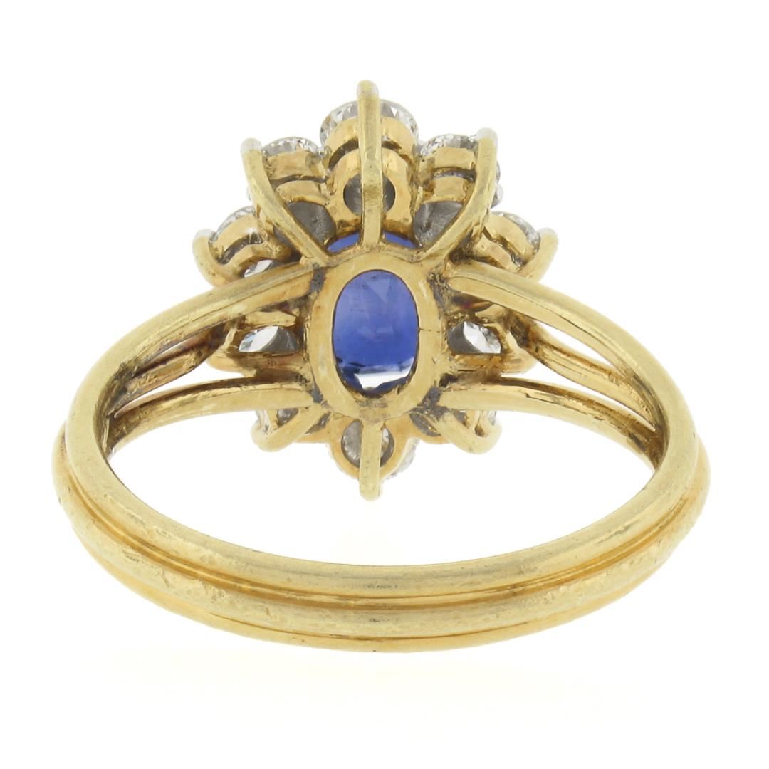 A solid 18k yellow & white gold cocktail ring, with 1 GIA graded oval cut natural sapphire (2.15ct ), surrounded with a halo of 10 round cut natural diamonds (G/H - VS1/VS2 ; 0.80ctw). The ring is size 6.5, weighs a total of 4.38 grams, and measures 14.6mm wide. Comes with all original relevant certifications.