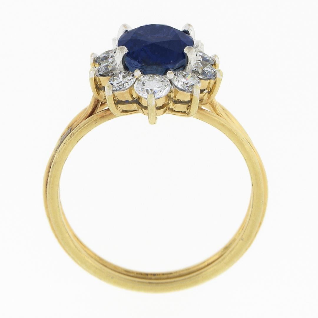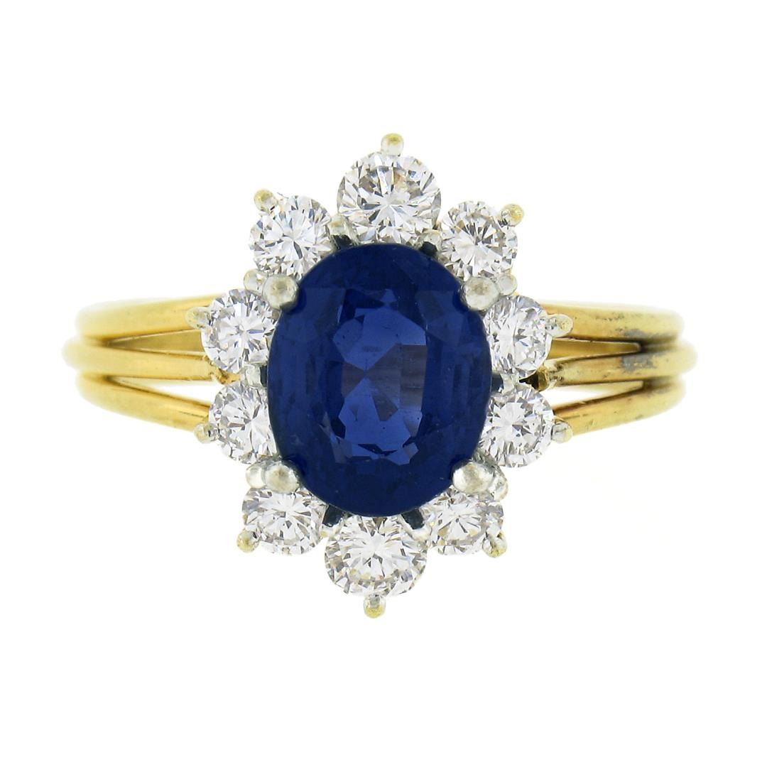 A solid 18k yellow & white gold cocktail ring, with 1 GIA graded oval cut natural sapphire (2.15ct ), surrounded with a halo of 10 round cut natural diamonds (G/H - VS1/VS2 ; 0.80ctw). The ring is size 6.5, weighs a total of 4.38 grams, and measures 14.6mm wide. Comes with all original relevant certifications.