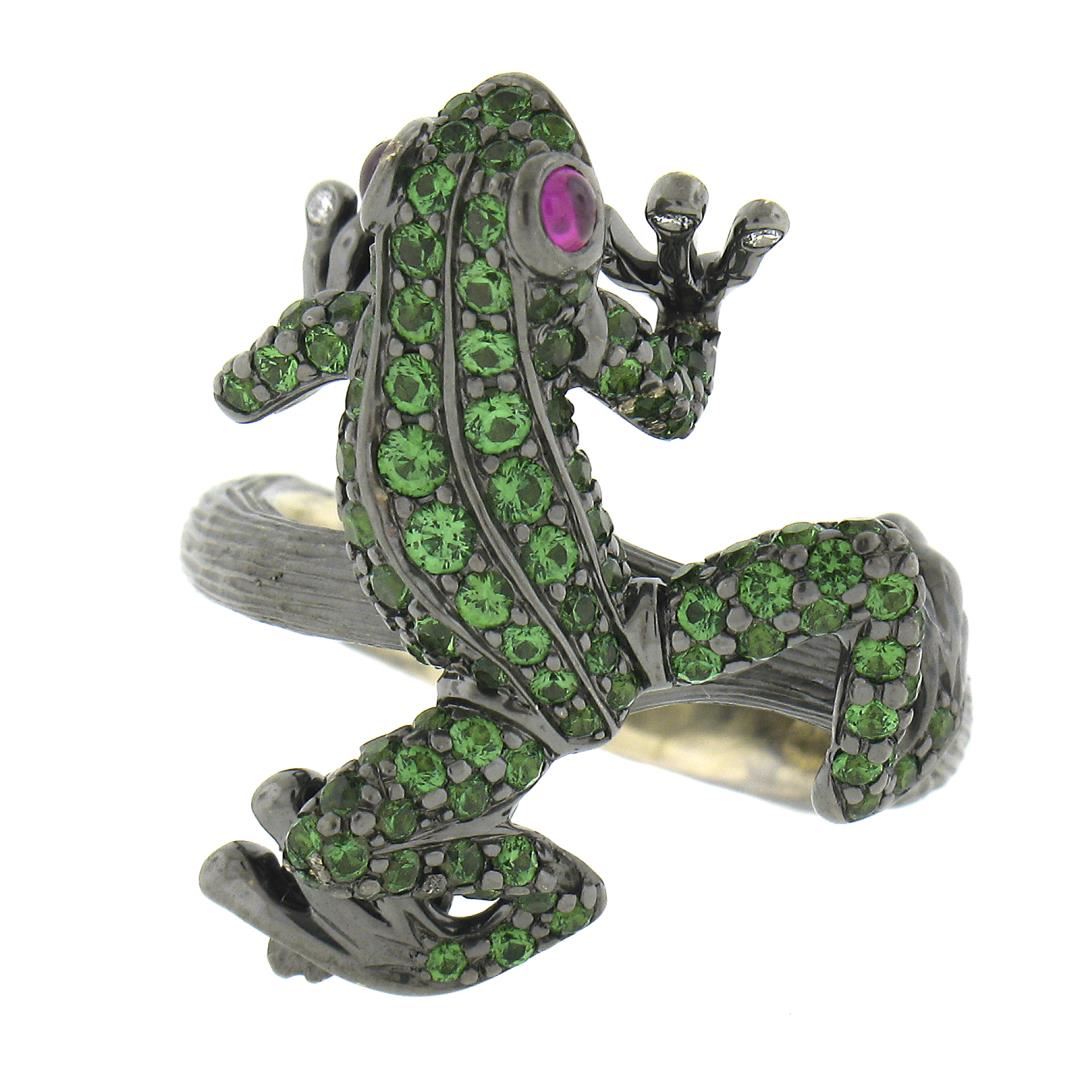 18K Gold & Black Rhodium Pave Tsavorite & Red Eyes Frog Body Cocktail Ring
