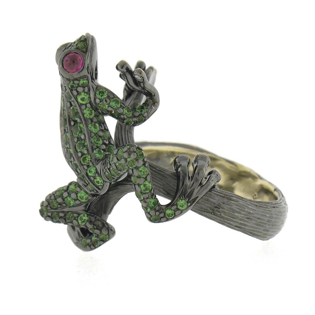 18K Gold & Black Rhodium Pave Tsavorite & Red Eyes Frog Body Cocktail Ring