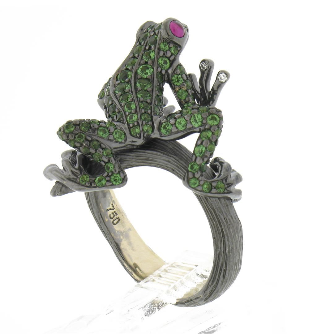18K Gold & Black Rhodium Pave Tsavorite & Red Eyes Frog Body Cocktail Ring