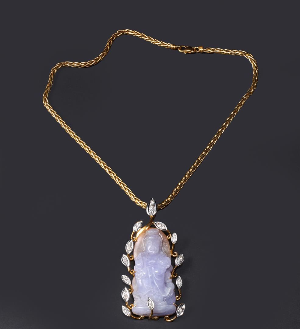 18K Gold, Carved Jadeite & Diamond Pendant & Necklace by Victor Loo containing twenty-seven round cut brilliant diamonds weighing approximately 1.60 cts Total weight of 55.6 gm. Estimated retail value $7,800.