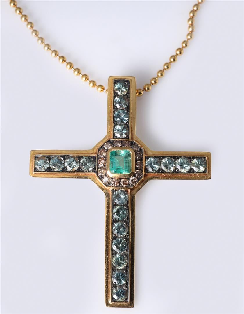 18k yellow gold cross pendant by Carlo Rici; with central bright green emerald surrounded by row of cognac diamonds on black oxidized ground, the arms of the cross set with numerous green sapphires; on gold beaded chain, the clasp marked 750 and pendant m