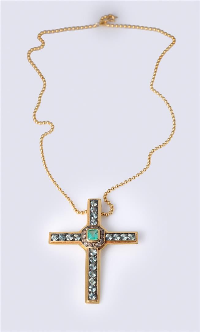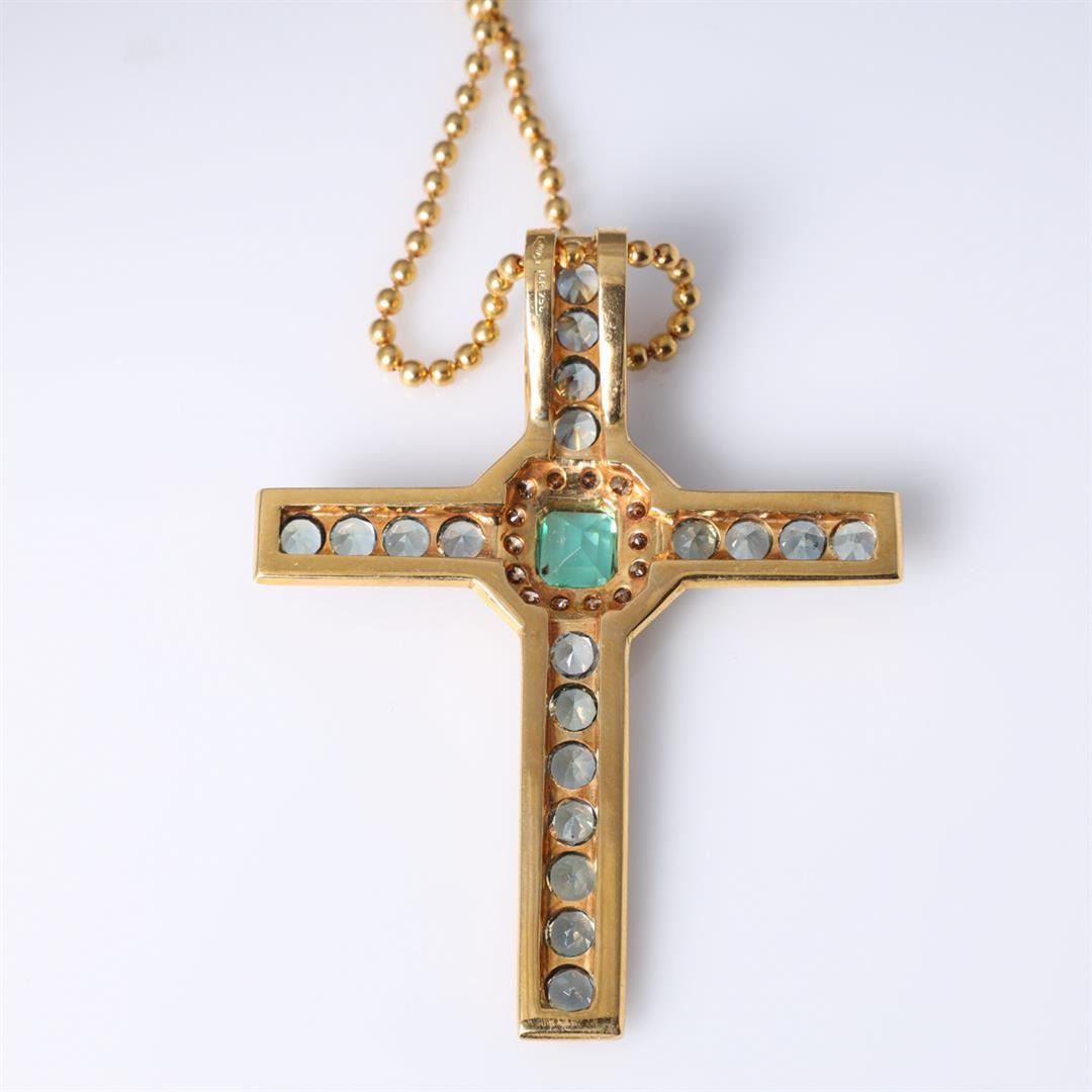 18k yellow gold cross pendant by Carlo Rici; with central bright green emerald surrounded by row of cognac diamonds on black oxidized ground, the arms of the cross set with numerous green sapphires; on gold beaded chain, the clasp marked 750 and pendant m