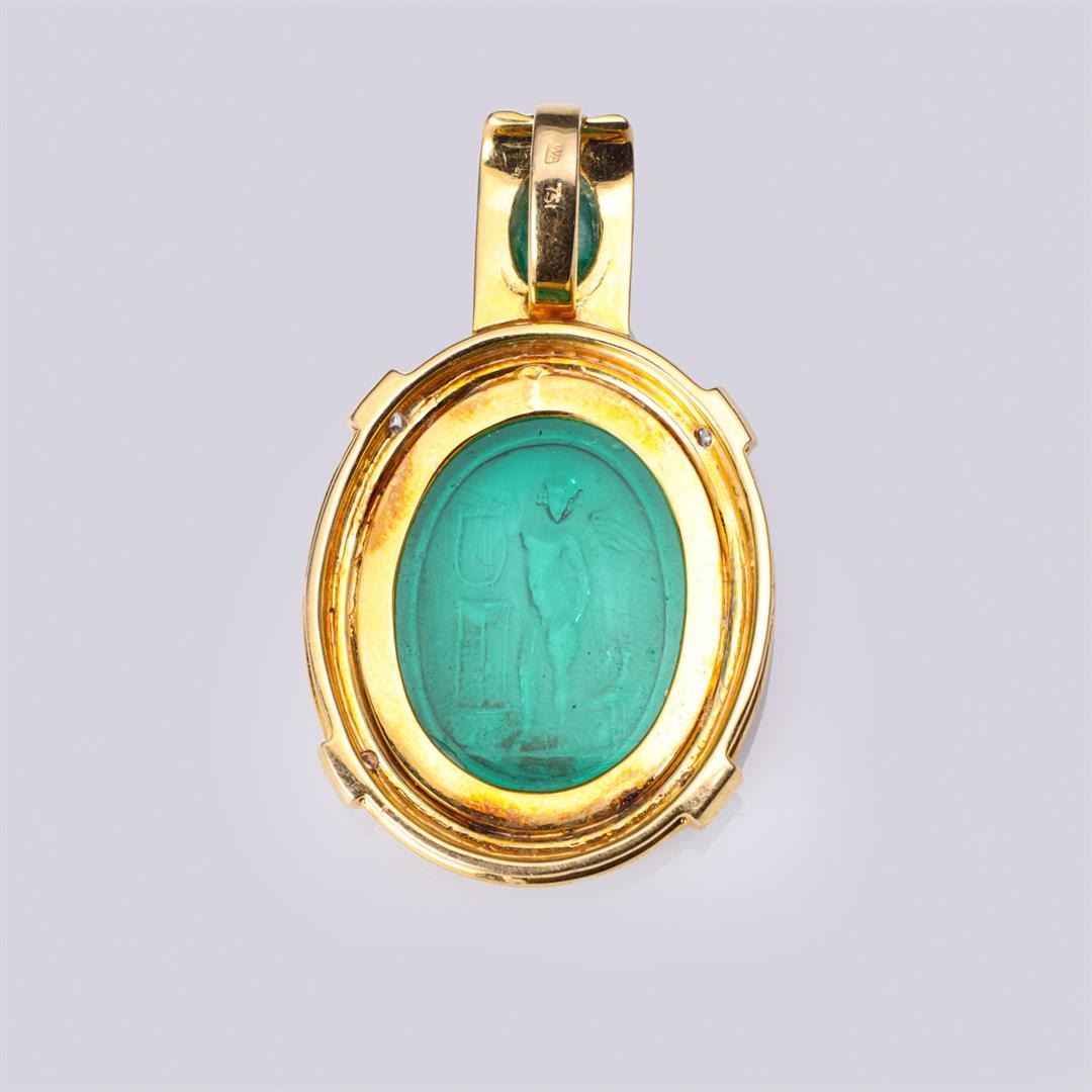 18K Gold, Emerald & Diamond Pendant with Antique Venetian Glass Cameo Medallion containing oval cabochon emerald weighing approximately 1.0 cts. Four diamonds weighing approximately 0.12 cts. Total weight of 14.2 gm. Estimated retail value $3,800.