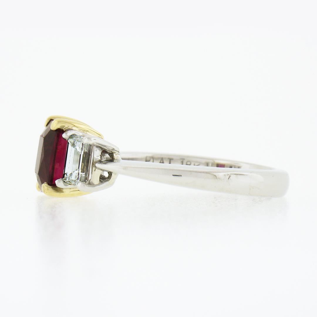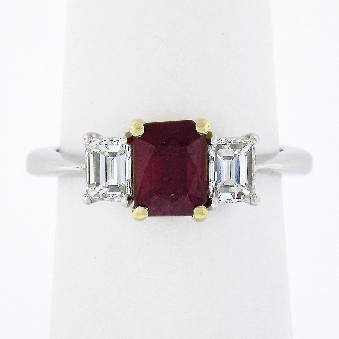 A solid platinum & 18k yellow gold ring, with 1 GIA graded rectangular cut natural Burma ruby (1.50ct ), and 2 emerald cut natural diamonds (G/H - VS1/VS2 ; 0.65ctw). The ring is size 6.0, weighs a total of 5.60 grams, and measures 7.3mm wide. Comes with all original relevant certifications.