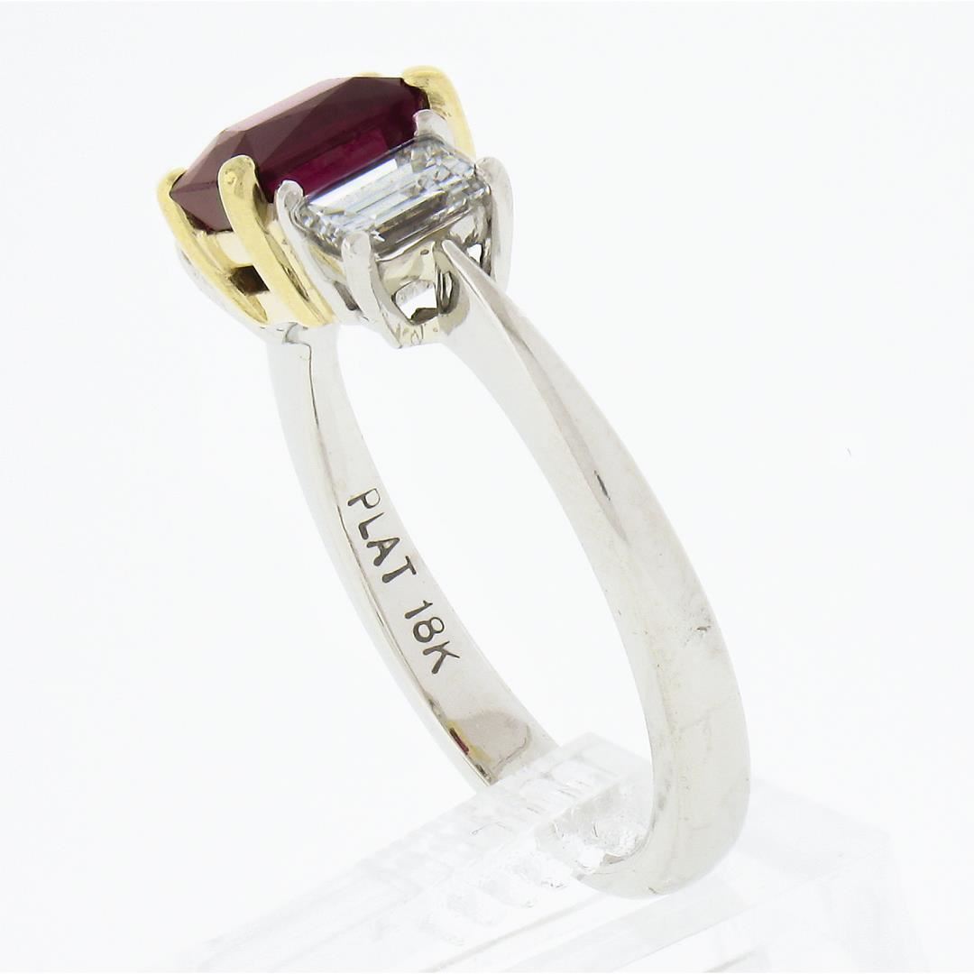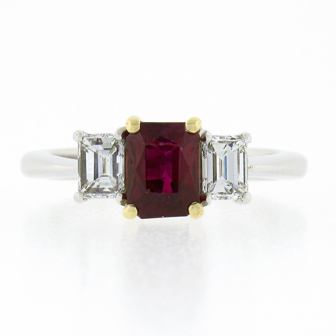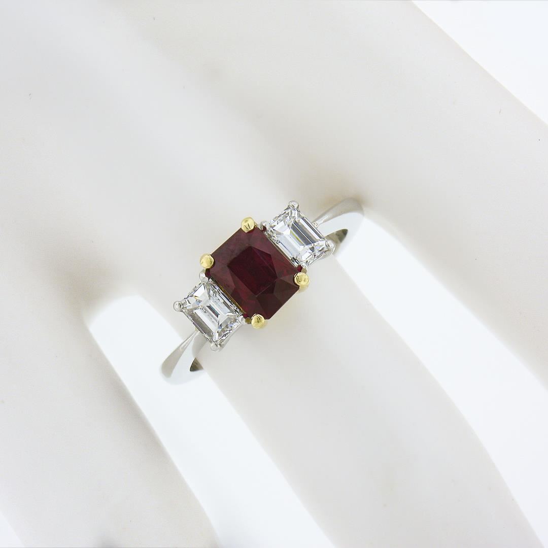 A solid platinum & 18k yellow gold ring, with 1 GIA graded rectangular cut natural Burma ruby (1.50ct ), and 2 emerald cut natural diamonds (G/H - VS1/VS2 ; 0.65ctw). The ring is size 6.0, weighs a total of 5.60 grams, and measures 7.3mm wide. Comes with all original relevant certifications.