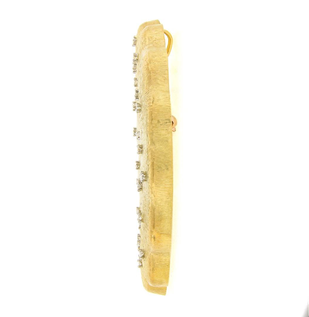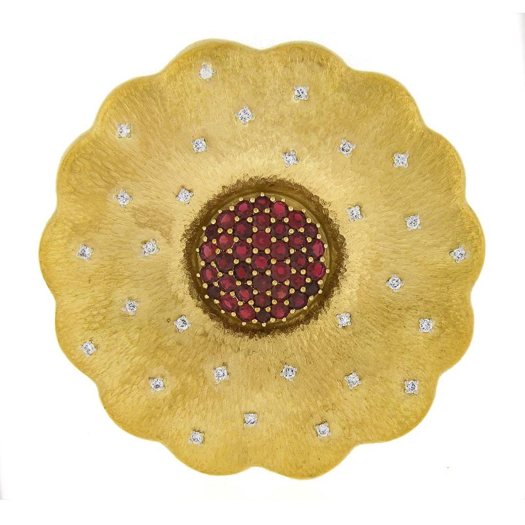 a solid 18k yellow gold & platinum large flower pendant brooch, with 29 round cut natural diamonds (G/H - VS1-VS2 ; 1.10ctw ), and 37 round cut natural rubies (7+ctw). Measures 77.4mm in diameter and weighs a total of 60.15 grams, inside bail measurements 9x5.3mm.