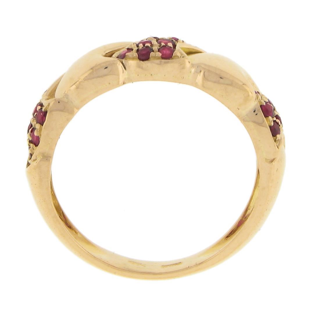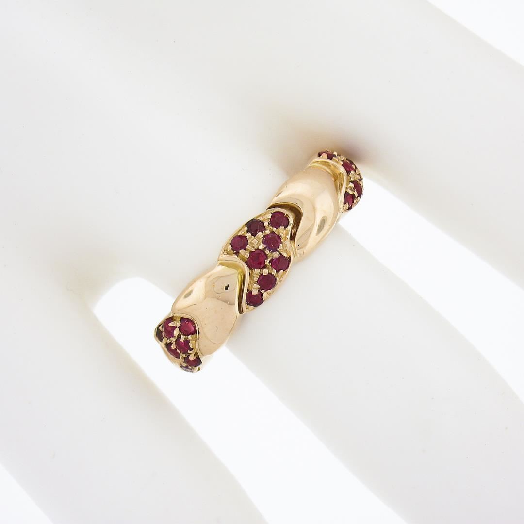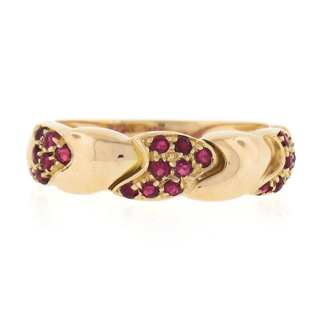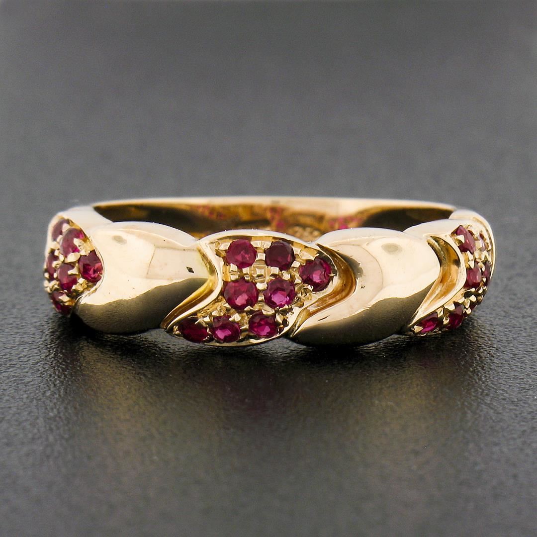 a solid 18k rose gold band ring, with 24 round cut natural rubies (0.36ctw). The ring is size 7.0, weighs a total of 4.78 grams, and measures 5.65mm wide.