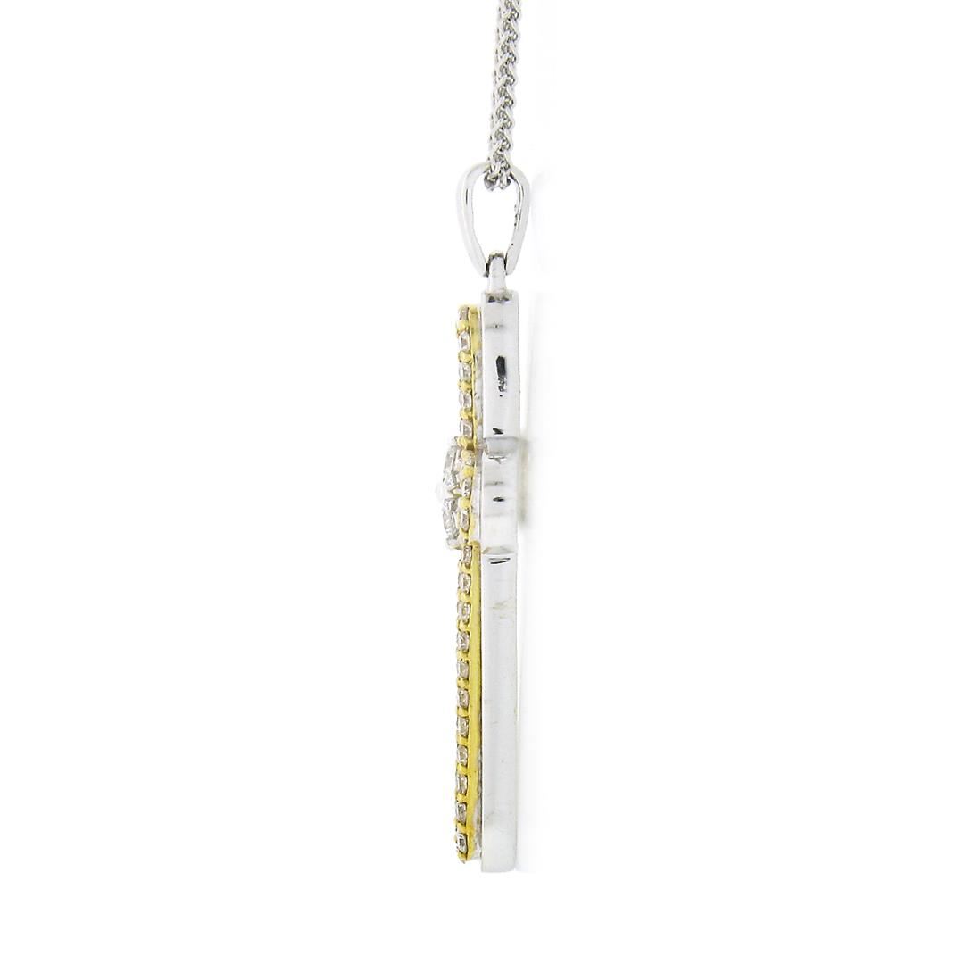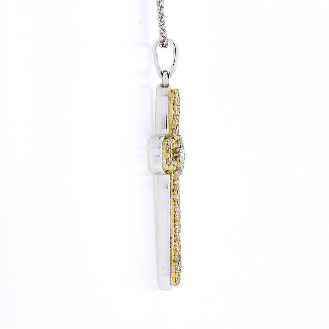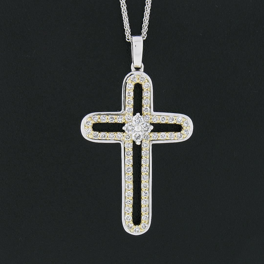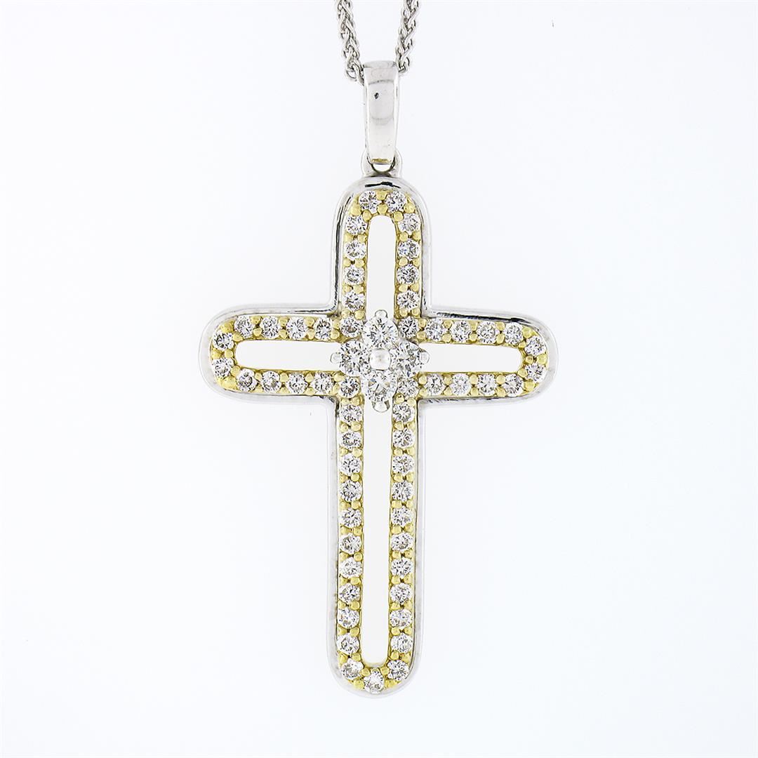 A solid 18k & 14k yellow & white gold open cross pendant necklace, featuring 61 round brilliant cut natural diamonds (G/H - VS1/VS2 ; 0.60ctw). 18.5 inch wheat link chain, 5.06 grams total weight, pendant measures 33.90x19.15mm.