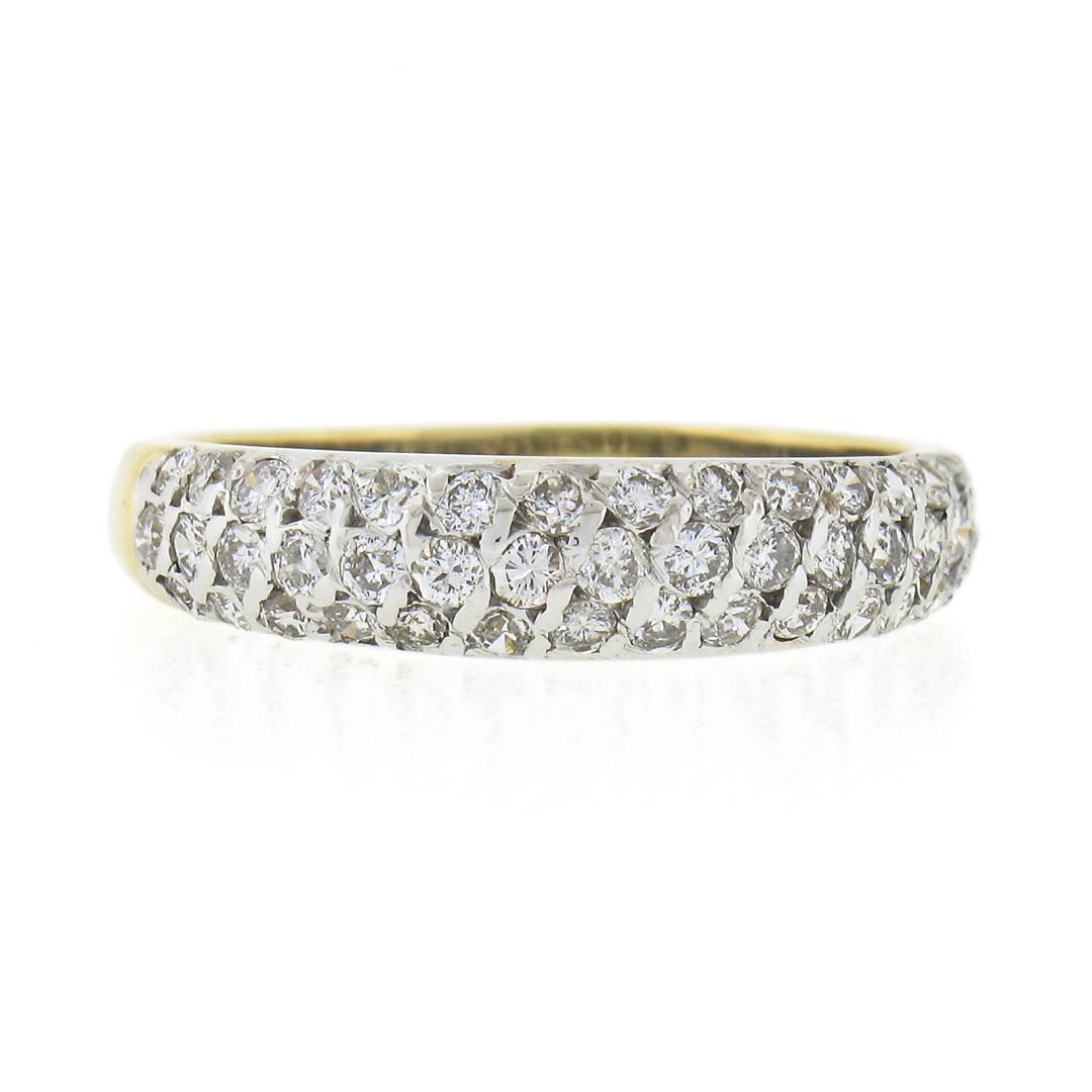 A solid 18k yellow & white gold band ring, with 43 round brilliant cut natural diamonds (H/I - SI1/SI2 w/ a few I1 ; 0.65ctw). The ring is size 7.0, weighs a total of 3.10 grams, and measures 4.6mm wide.