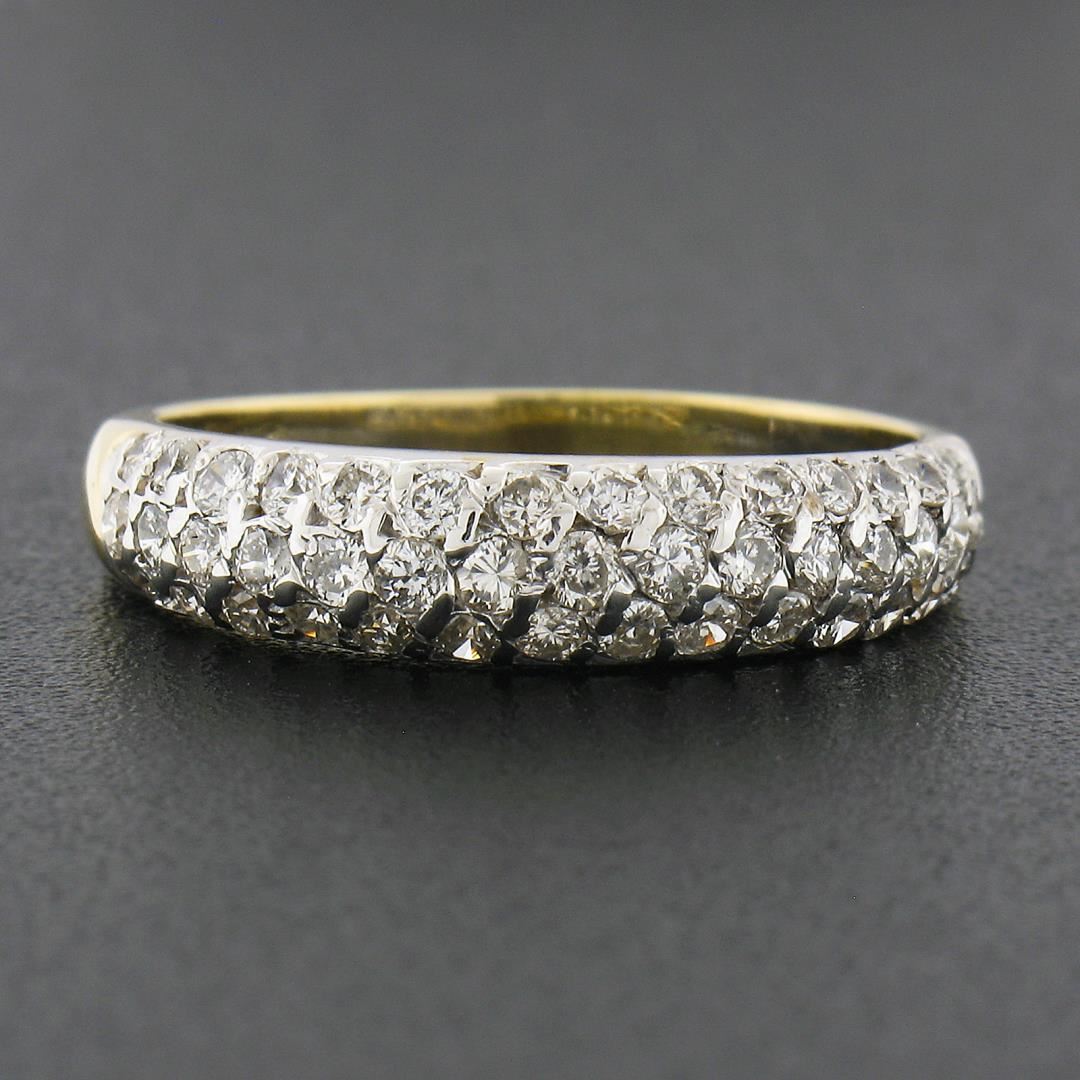 A solid 18k yellow & white gold band ring, with 43 round brilliant cut natural diamonds (H/I - SI1/SI2 w/ a few I1 ; 0.65ctw). The ring is size 7.0, weighs a total of 3.10 grams, and measures 4.6mm wide.