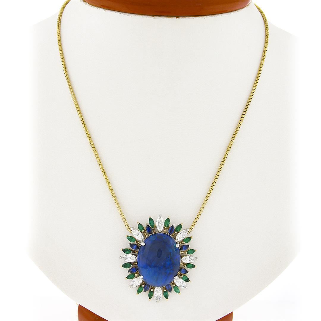 A solid 18k yellow and white gold pendant necklace, with 1 Gia certified oval cabochon cut natural opal (19.49ct ), surrounded with a halo of 16 marquise cut natural emeralds (1.25ctw), 8 marquise cut natural sapphires (0.72ctw), and 8 marquise cut natura