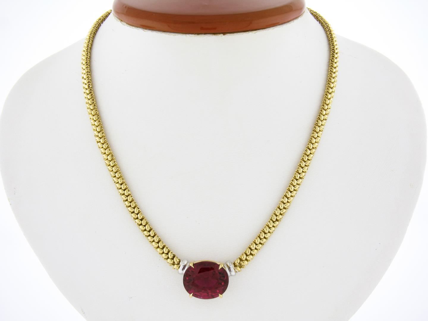 A solid 18k yellow & white gold necklace, with 1 GIA graded oval cut natural rubellite tourmaline (12.82ct). 16 inch Braided link chain, 35.90 grams total weight, pendant measures 13.1x20.8mm. Comes with all original relevant certifications.