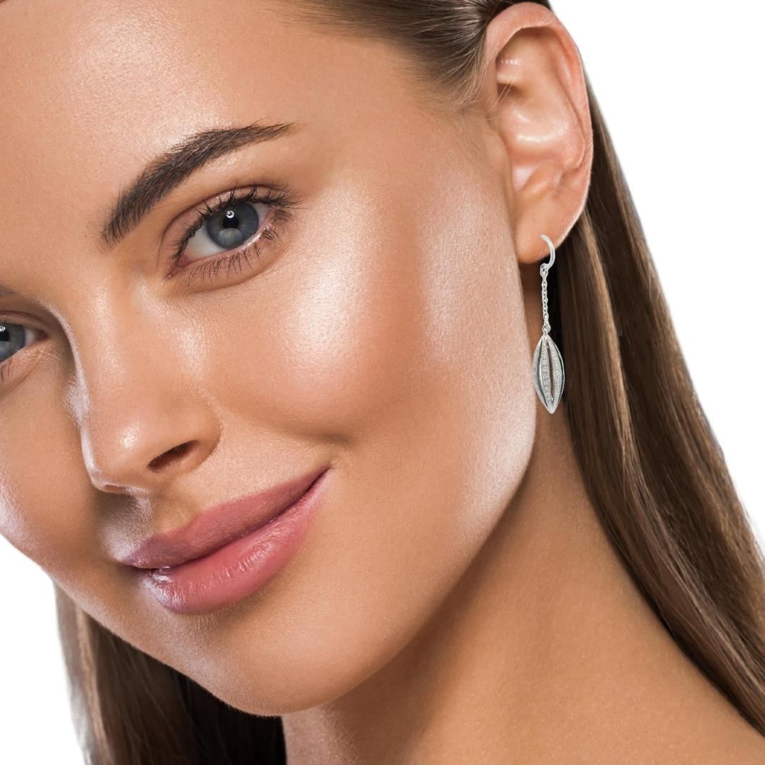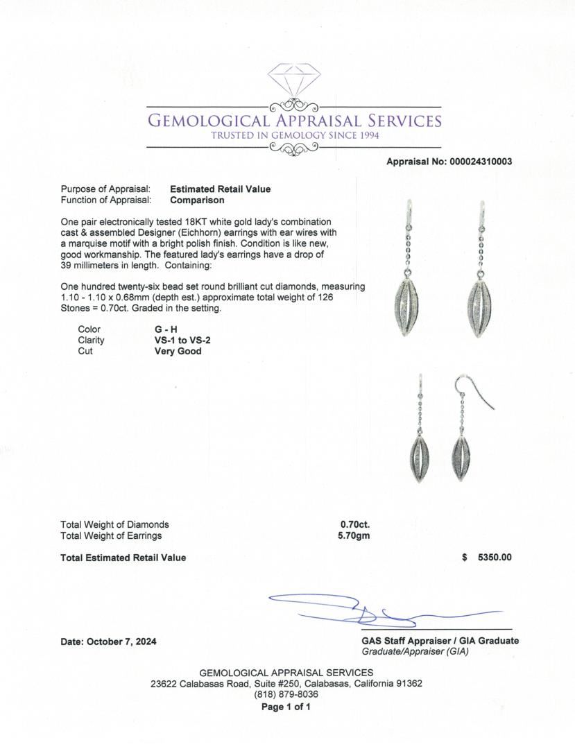 A pair of 18KT white gold marquise motif earrings featuring 0.70ct of round brilliant cut diamonds graded VS-1 to VS-2 clarity. The earrings have a 39mm drop and are designed with elegant ear wires.