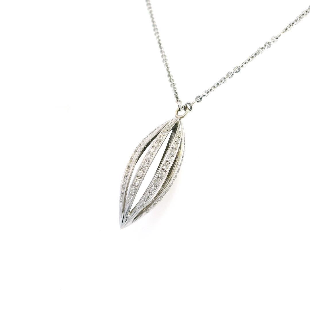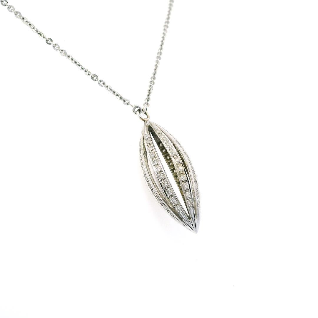 An 18KT white gold marquise motif pendant with a 16-inch chain. Adorned with 0.80ct total weight of round brilliant cut diamonds, graded VS-1 to VS-2 clarity. The pendant features a 33mm drop and is secured with a lobster claw clasp.
