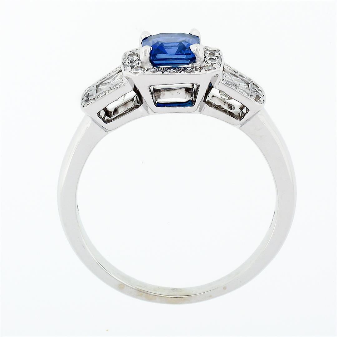 A solid 18k white gold solitaire ring, with 1 AGL certified square emerald cut natural sapphire (5.36 x 5.05mm; 0.88ct), and 2 princess cut natural diamonds (G/H - VS1; 0.26ctw), surrounded with 32 round brilliant cut natural diamonds (G/H - VS1/VS2; 0.56ctw). The ring is size 6.5, weighs a total of 5.19 grams, and measures 8.35mm wide. Comes with all original relevant certifications.