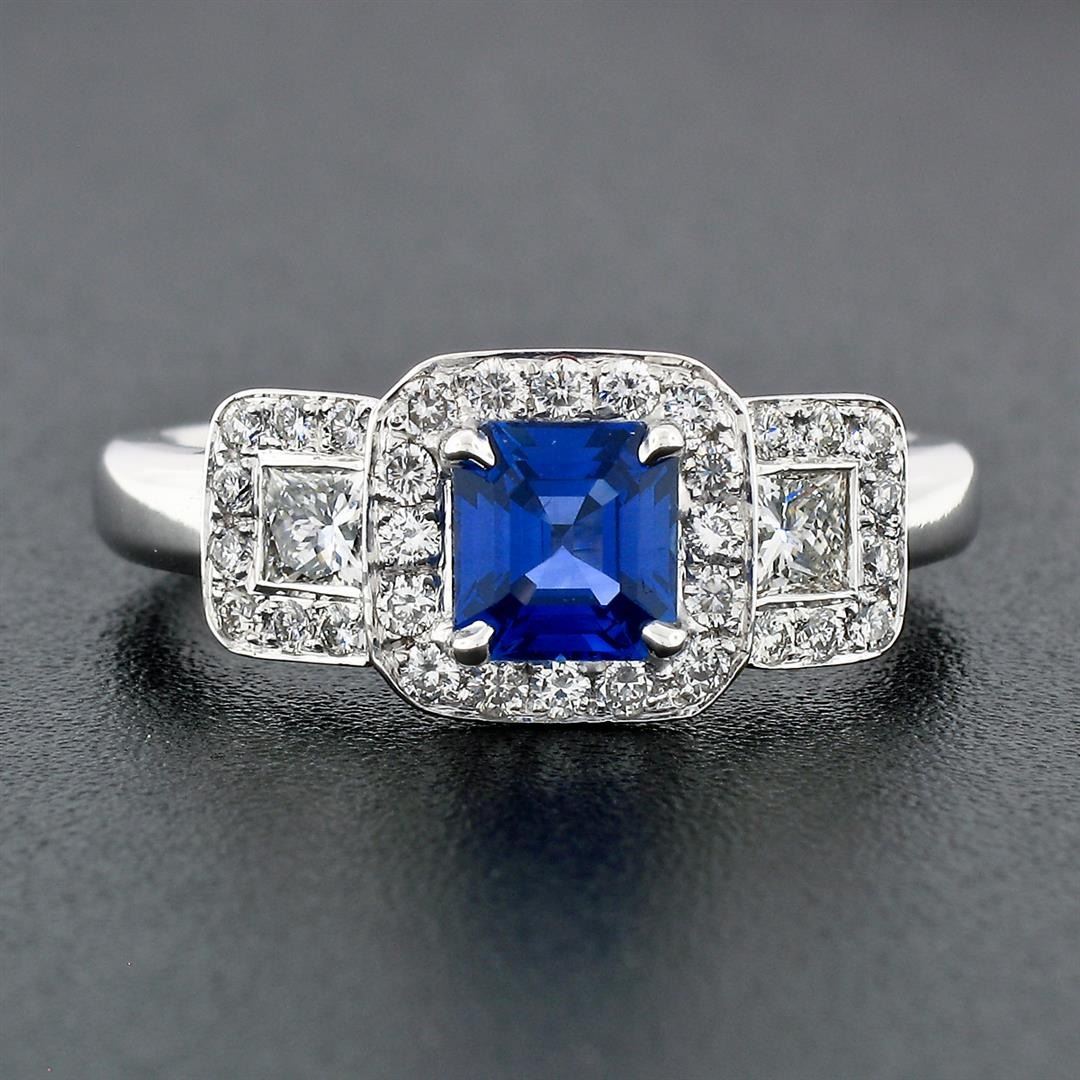 A solid 18k white gold solitaire ring, with 1 AGL certified square emerald cut natural sapphire (5.36 x 5.05mm; 0.88ct), and 2 princess cut natural diamonds (G/H - VS1; 0.26ctw), surrounded with 32 round brilliant cut natural diamonds (G/H - VS1/VS2; 0.56ctw). The ring is size 6.5, weighs a total of 5.19 grams, and measures 8.35mm wide. Comes with all original relevant certifications.