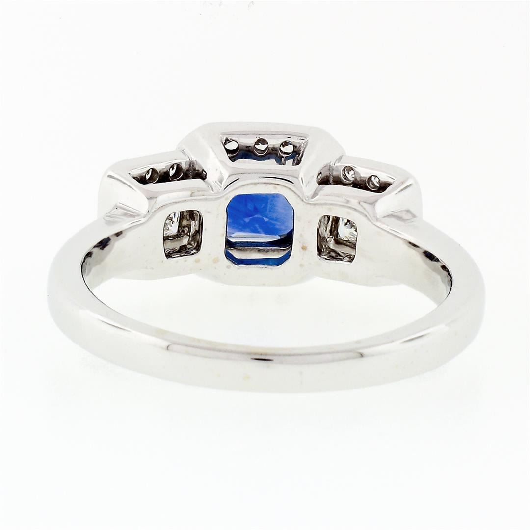 A solid 18k white gold solitaire ring, with 1 AGL certified square emerald cut natural sapphire (5.36 x 5.05mm; 0.88ct), and 2 princess cut natural diamonds (G/H - VS1; 0.26ctw), surrounded with 32 round brilliant cut natural diamonds (G/H - VS1/VS2; 0.56ctw). The ring is size 6.5, weighs a total of 5.19 grams, and measures 8.35mm wide. Comes with all original relevant certifications.