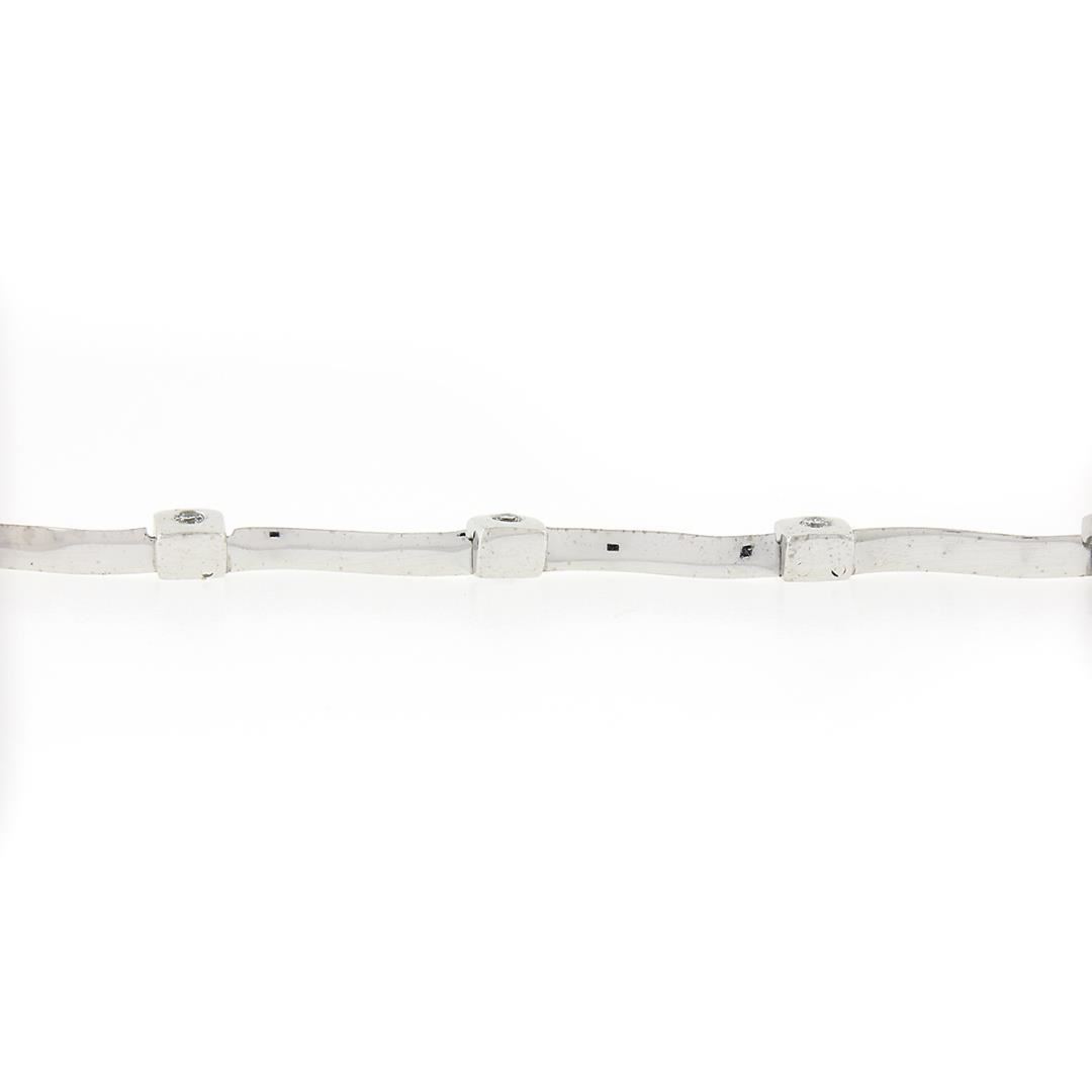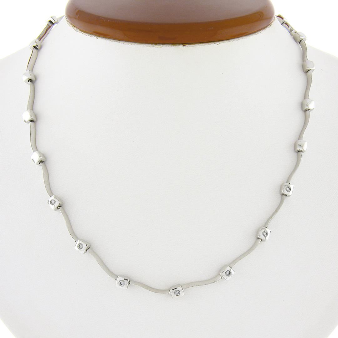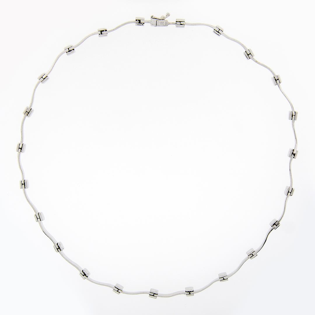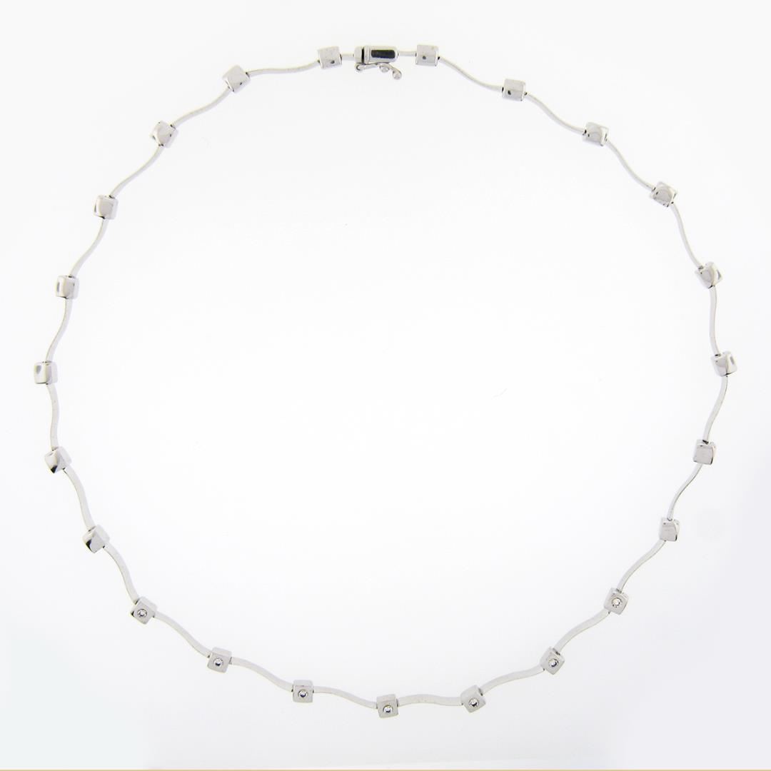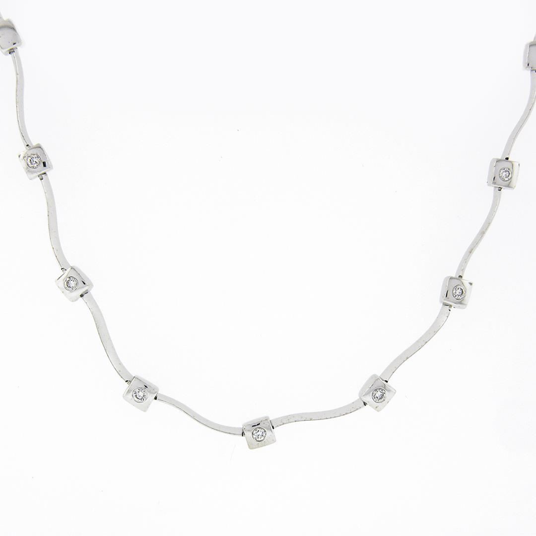 A solid 18k white gold wavy necklace, with 7 round brilliant cut natural diamonds (G/H - VS1/VS2; 0.14ctw).It weighs a total of 24.33 grams, measures 4mm wide, and measures 16 inches in length.