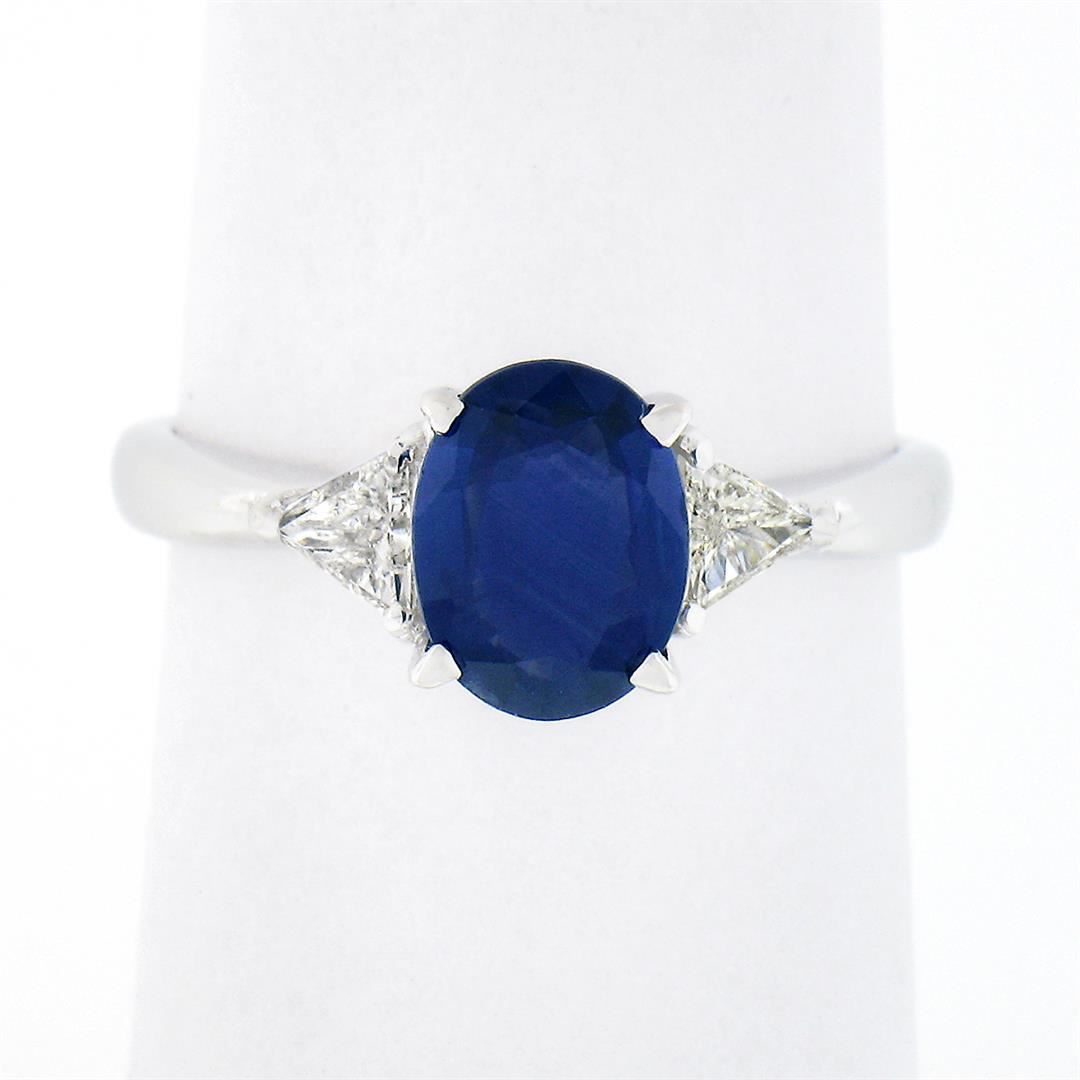 A solid 18k white gold 3 stones ring, with 1 Gia certified oval cut natural sapphire (1.65ct ), and 2 trillion cut natural diamonds (H/I - VS2 ; 0.56ctw). The ring is size 7.0, weighs a total of 3.32 grams, and measures 8.15mm wide. Comes with all original relevant certifications.