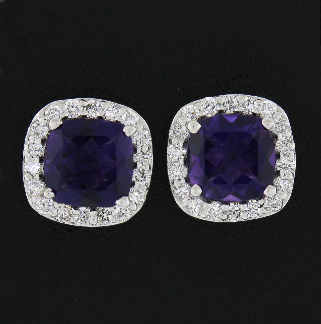A new solid 18k white gold stud earrings, with 2 cushion cut natural amethysts (2.40ctw), surrounded with a halo of 36 round cut natural diamonds (G/H - VS2/SI1 ; 0.53ctw). The earrings measure approximately 10.5x10.45mm and weigh a total of 3.84 grams.