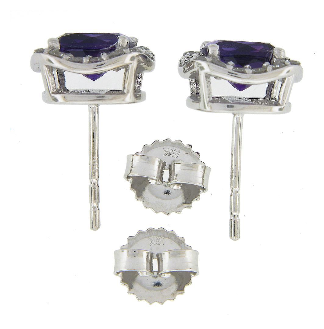 A new solid 18k white gold stud earrings, with 2 cushion cut natural amethysts (2.40ctw), surrounded with a halo of 36 round cut natural diamonds (G/H - VS2/SI1 ; 0.53ctw). The earrings measure approximately 10.5x10.45mm and weigh a total of 3.84 grams.