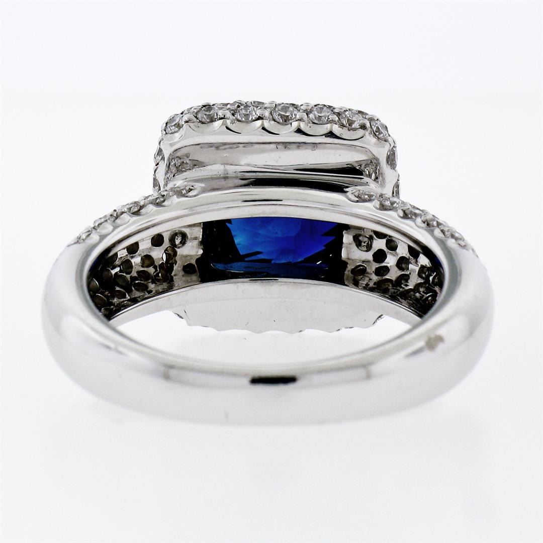 18K White Gold 3.93ctw GIA No Heat Cushion Sapphire Diamond Halo Engagement Ring. Please see photos and description for all available information. An estate solid 18k white gold engagement ring, with 1 Gia certified cushion cut natural sapphire (2.76ct ), and 153 round brilliant cut natural diamonds (F/G- S1/VS2; 1.17ctw). The ring is size 6.5, weighs a total of 10.00 grams, and measures 12.65mm wide. Comes with all original relevant certifications.