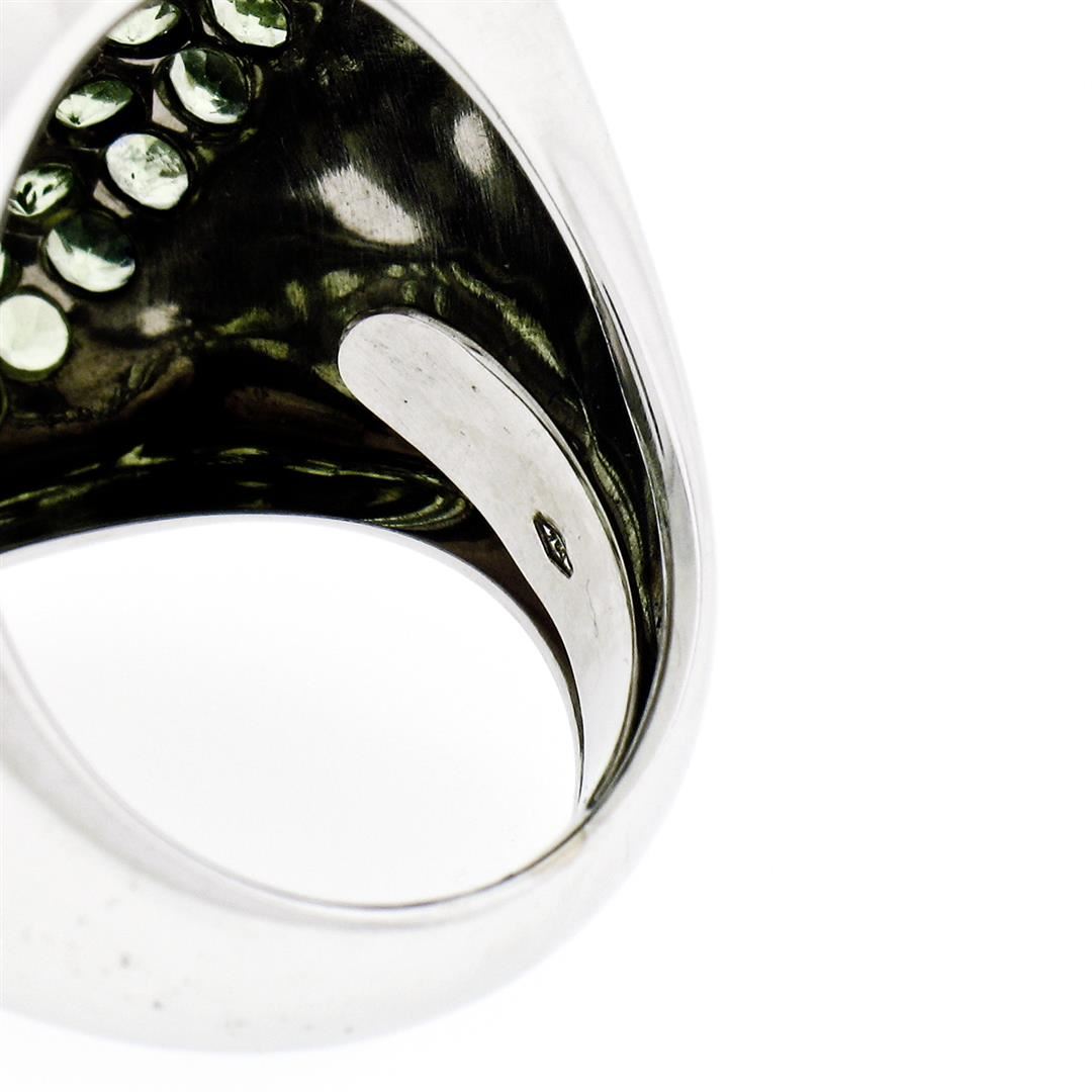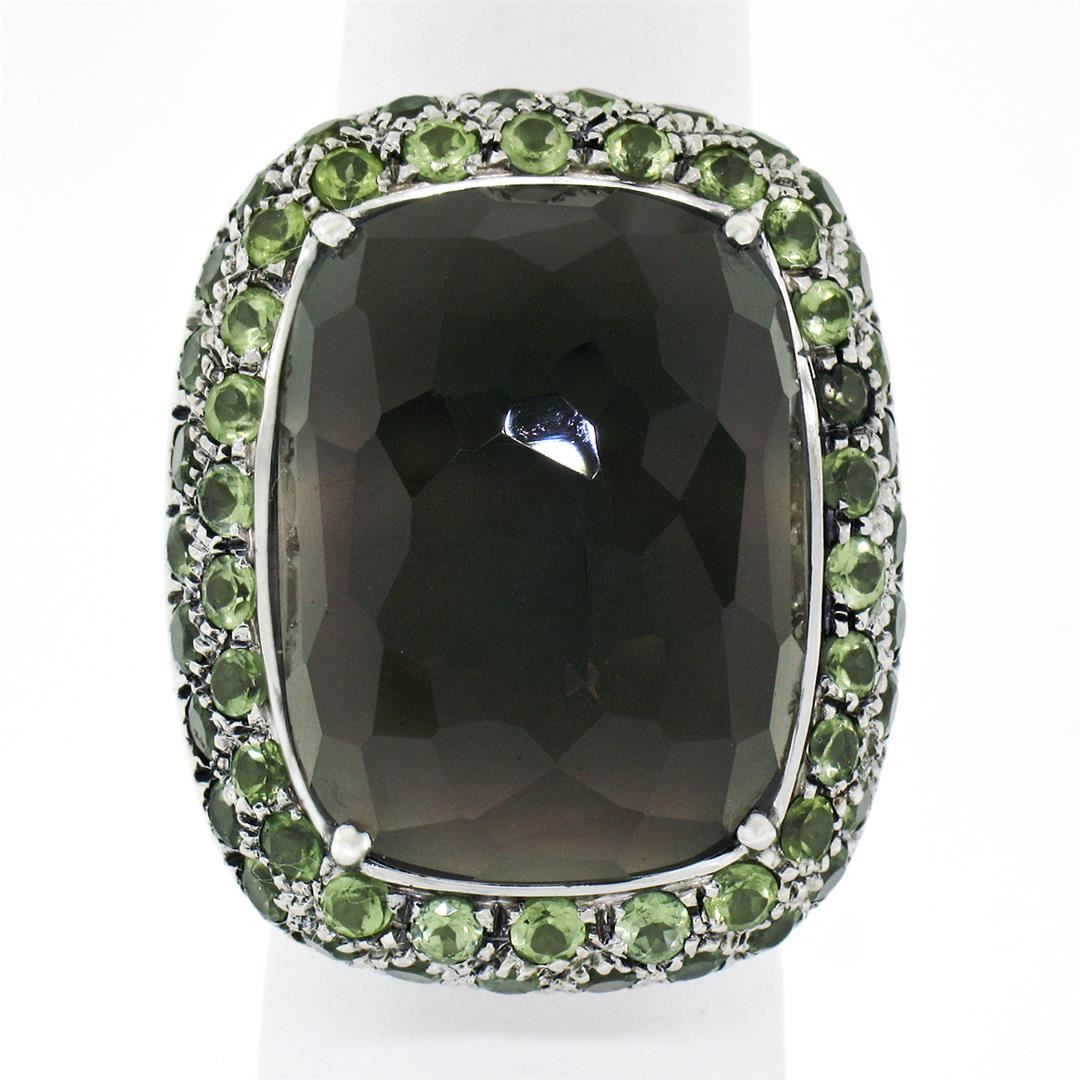 An estate solid 18k white gold solitaire ring, with 1 Domed Rectangular Cut nagural topaz (24.0x18.3mm - 35ct ), surrounded with 57 round cut natural peridot (2.60ctw). The ring is size 7.5, weighs a total of 22.02 grams, and measures 31.60mm wide.