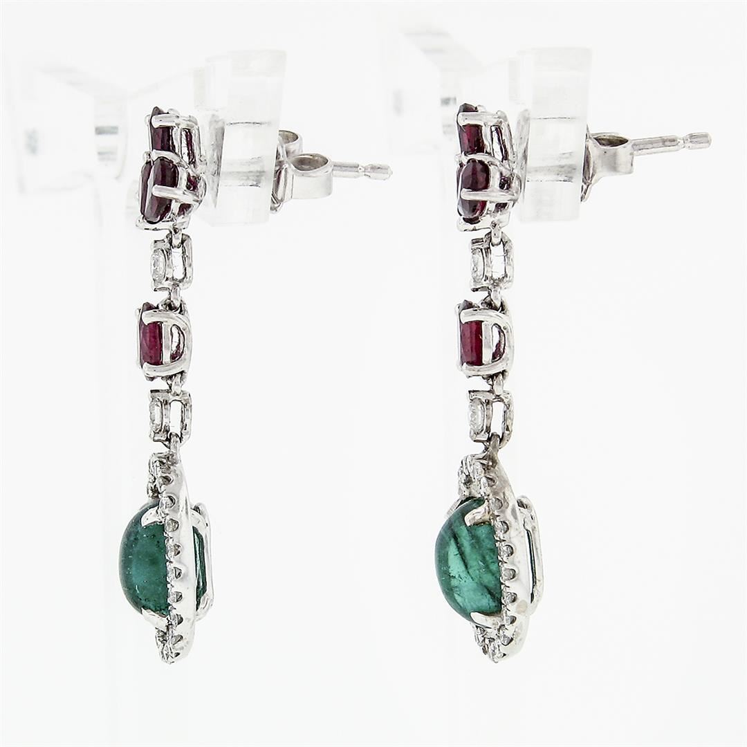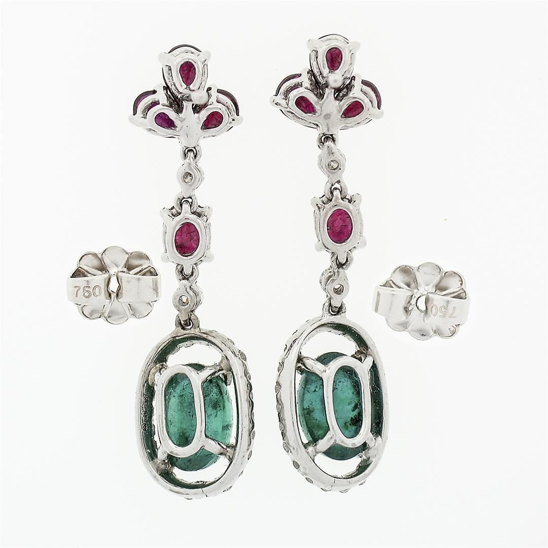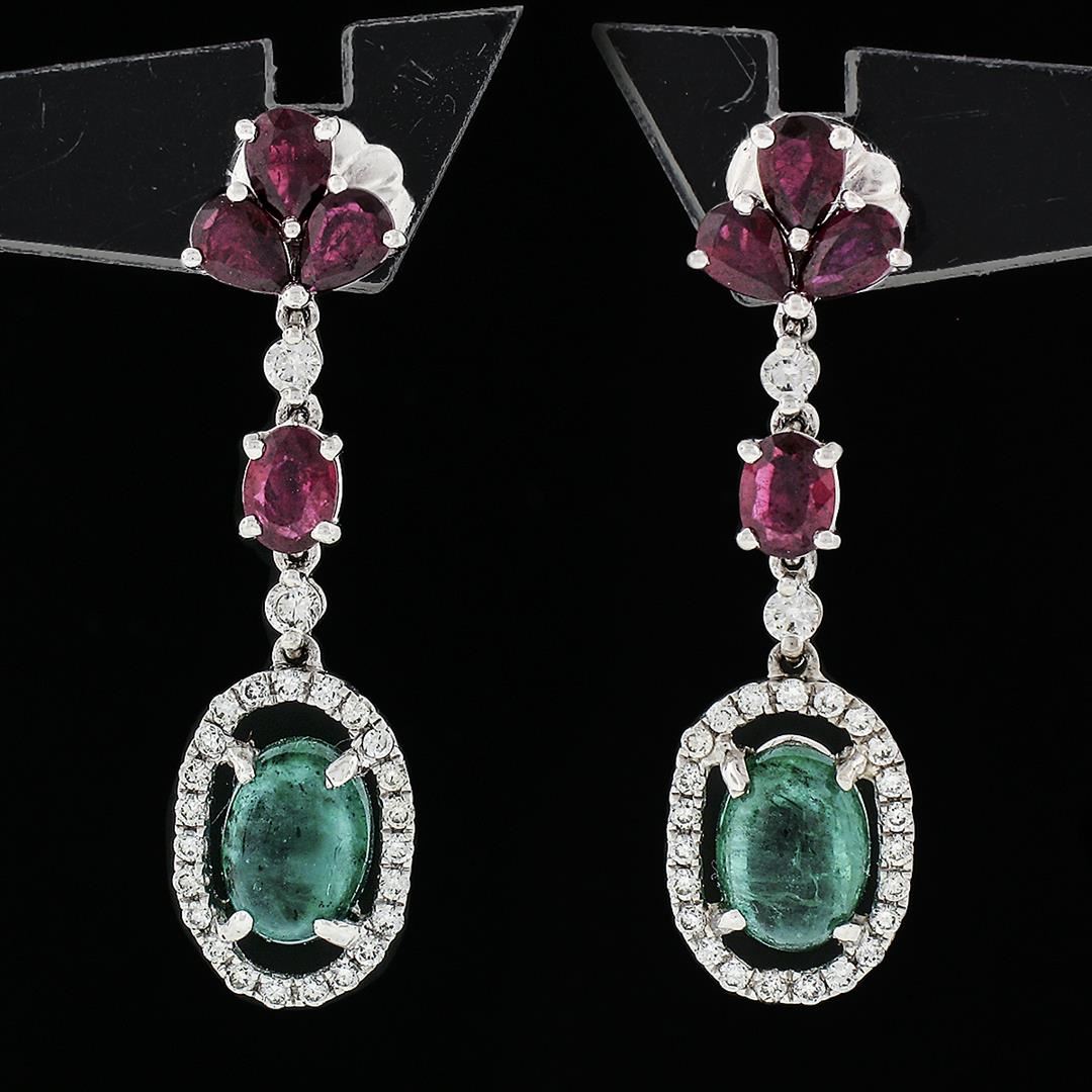 A pair of solid 18k white gold dangle drop earrings, with 2 oval cabochon cut natural emeralds (7x5mm ; 2.10ctw ), and 8 pear with oval cut natural rubies (1.70ctw ), with 50 round brilliant cut natural diamonds ( G/H - VS1/VS2 ; 0.35ctw). The earrings measure approximately 30x8.1mm and weigh a total of 3.67 grams.