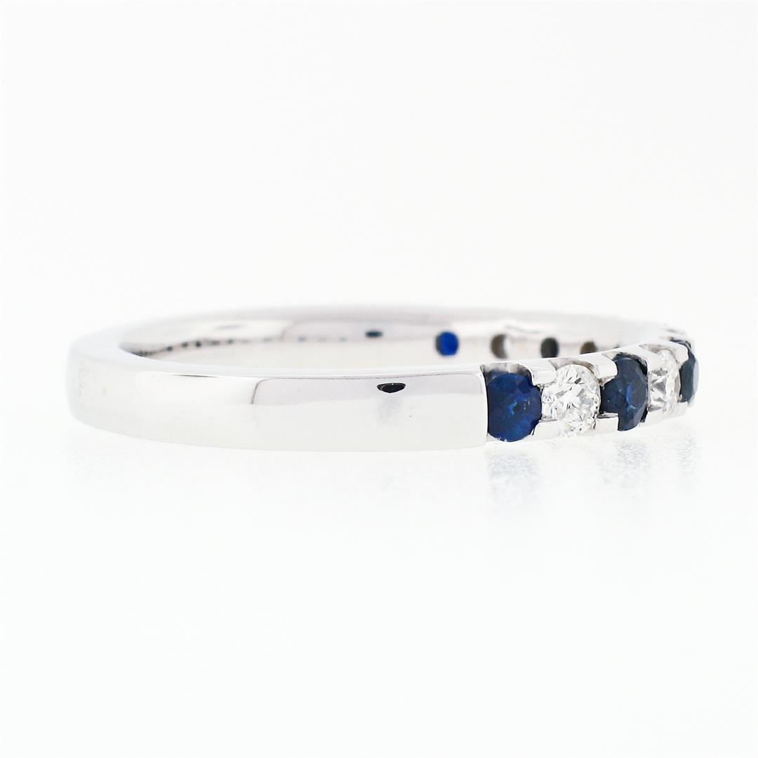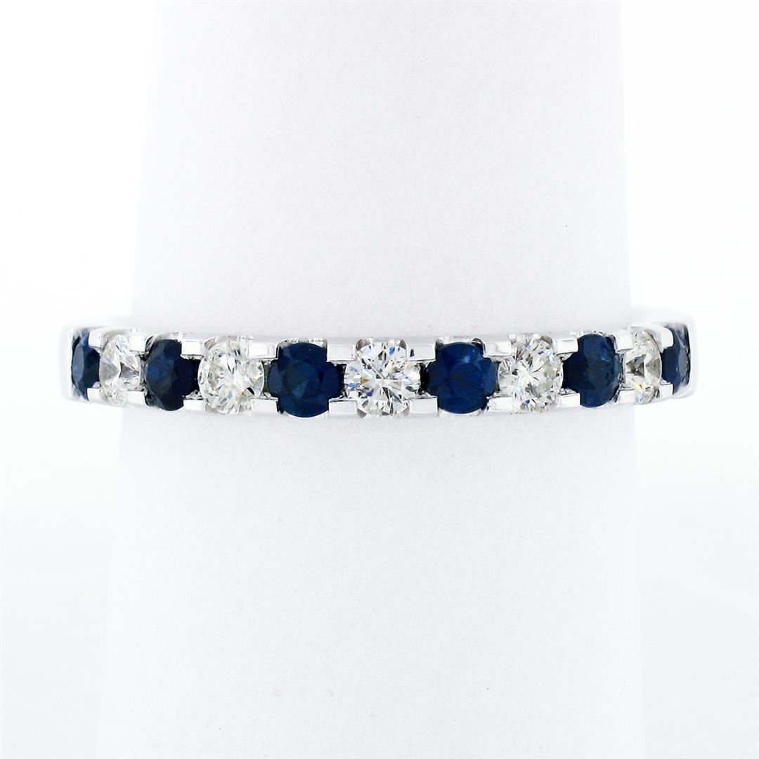 A solid 18k white gold stackable band ring with 6 round brilliant cut natural sapphires (0.60ctw) alternating with 3 round brillaint cut natural diamonds (G/H - VS2/SI1; 0.30ctw). The ring is size 9.5, weighs a total of 5.07 grams, and measures 3mm wide.