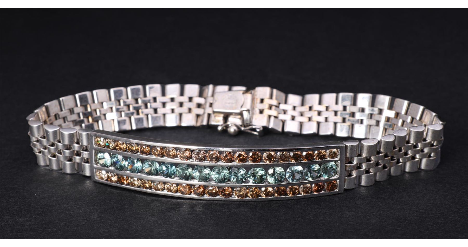 18K White Gold Cognac Diamond & Greenish Blue Sapphire ID Bracelet by Carlo Rici containing fourteen round sapphires weighing approximately 2.0 cts. Thirty-eight Cognac round brilliant cut diamonds weighing approximately 2.50 cts. Total weight of 32.9 gm.