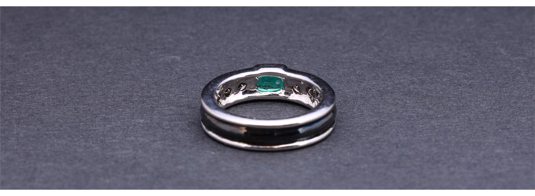 An 18k white gold designer ring by Carlo Rici with a fine bezel set faceted Columbian emerald of good color on a recessed band that has been oxidized black within narrow borders, each shoulder set with three full cut cognac diamonds, the interior of the r