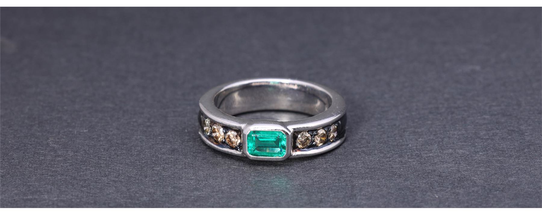 An 18k white gold designer ring by Carlo Rici with a fine bezel set faceted Columbian emerald of good color on a recessed band that has been oxidized black within narrow borders, each shoulder set with three full cut cognac diamonds, the interior of the r