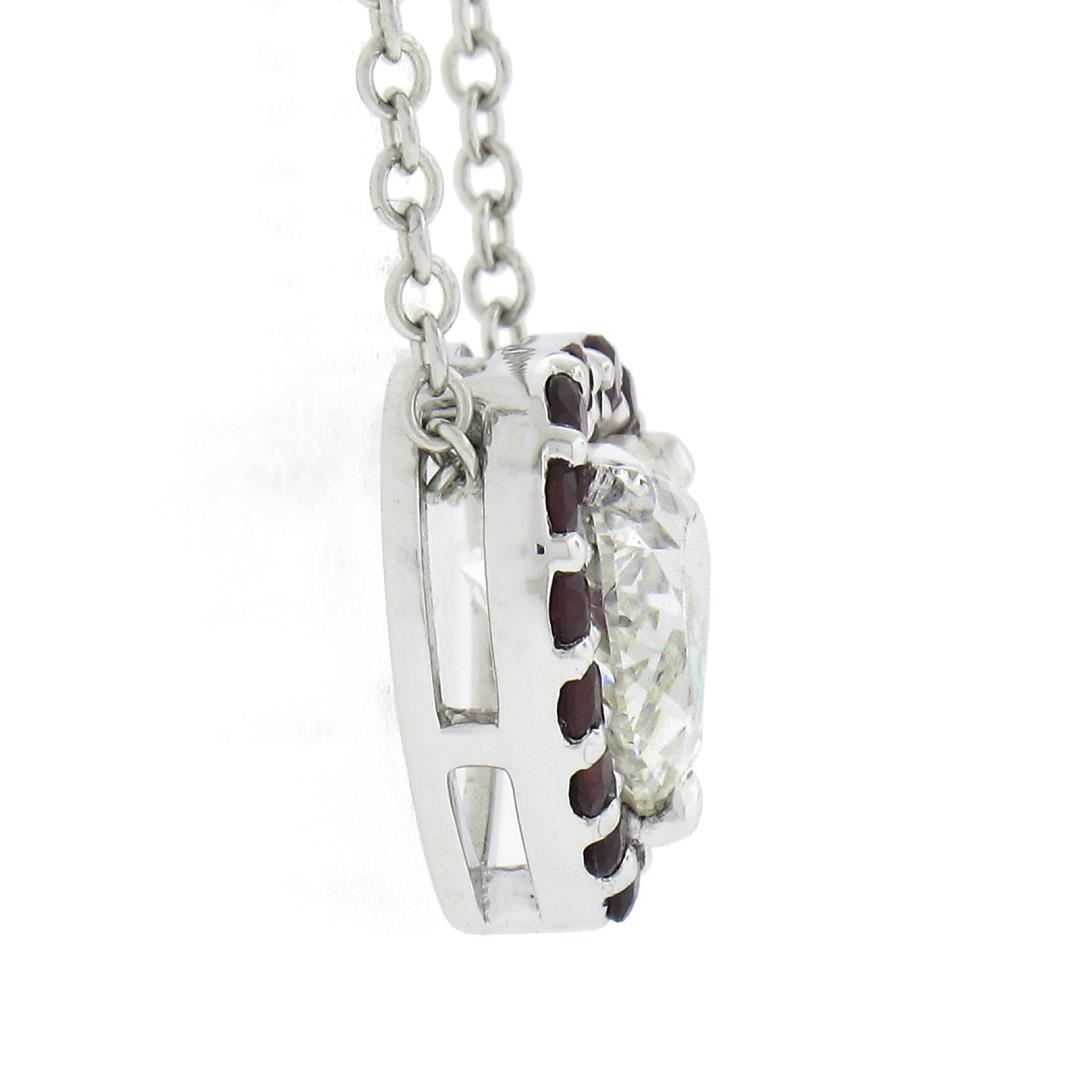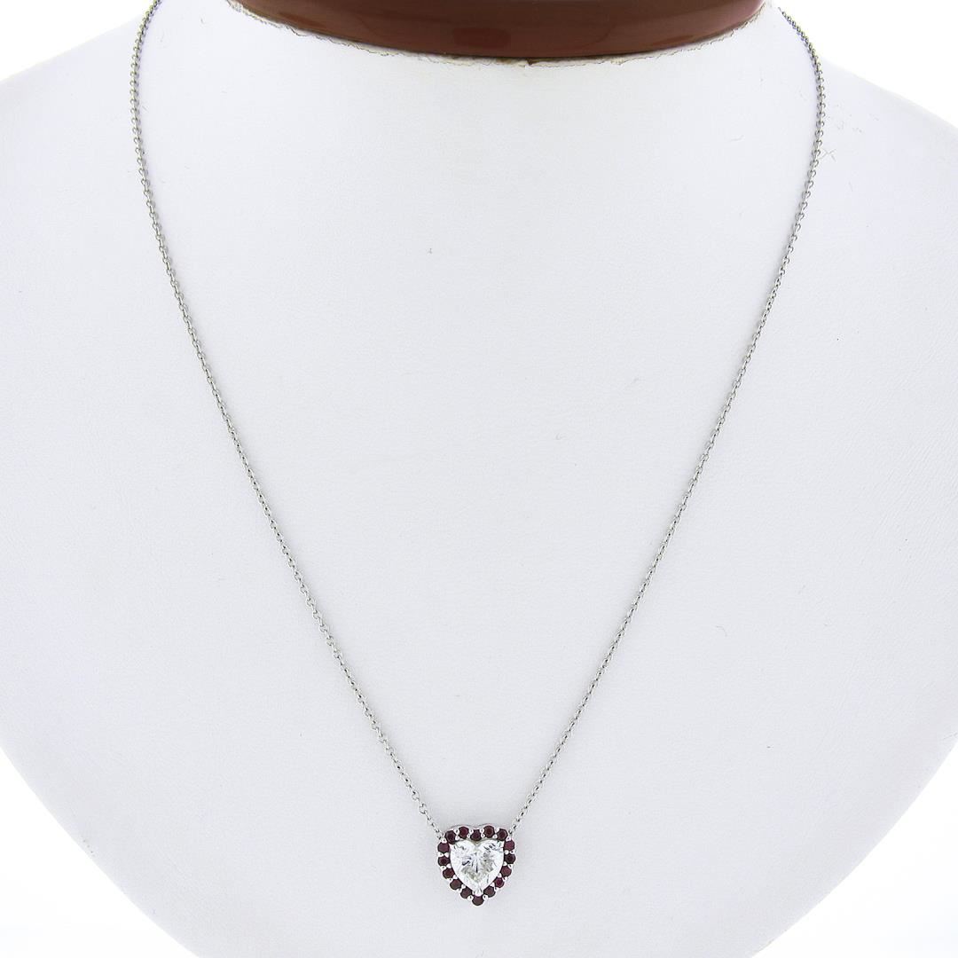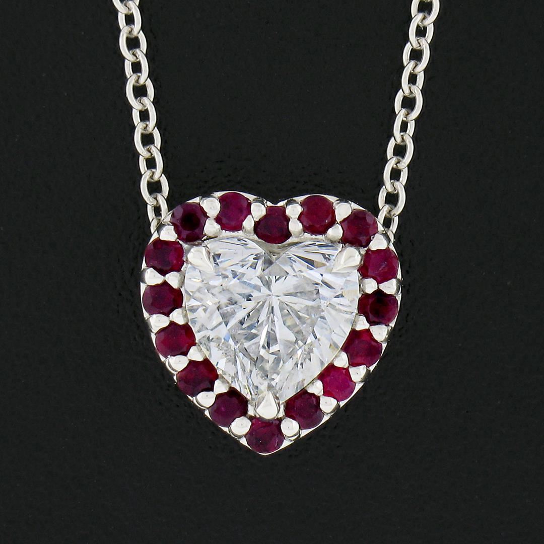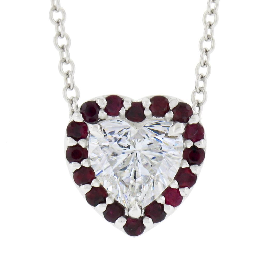 A new solid 18k white gold heart pendant necklace, with 1 GIA graded heart cut natural diamond (I - I2 ; 1.03), surrouned with a halo of 16 round cut natural rubies (0.31ctw). Adjustable 16 or 18 inch cable link chain, 3.37 grams total weight, pendant measures 10x10.1mm. Comes with all original relevant certifications.