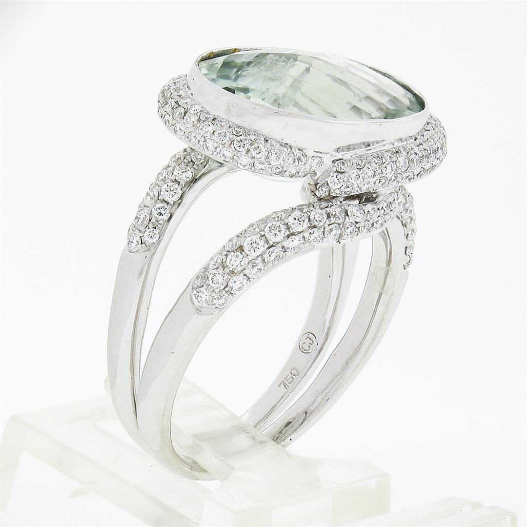 A solid 18k white gold ring, with 1 oval cut natural genuine prasiolite quartz (15.8x12.1mm), and numerous of round brilliant cut natural diamonds (F/G - VS1/VS2 ; 1.40ctw). The ring is size 9.5, weighs a total of 13.91 grams, and measures 16.40mm wide.