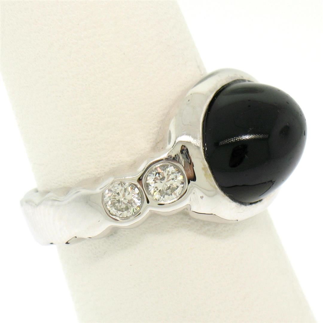 An estate solid 18k white gold bubble ring with 1 oval shape natural black onyx (1.49x9.20mm) and 4 ound brilliant cut natural diamonds (G- SI1; 0.45ctw). The ring is size 6.0, weighs a total of 7.9 grams, and measures 11.78mm wide.