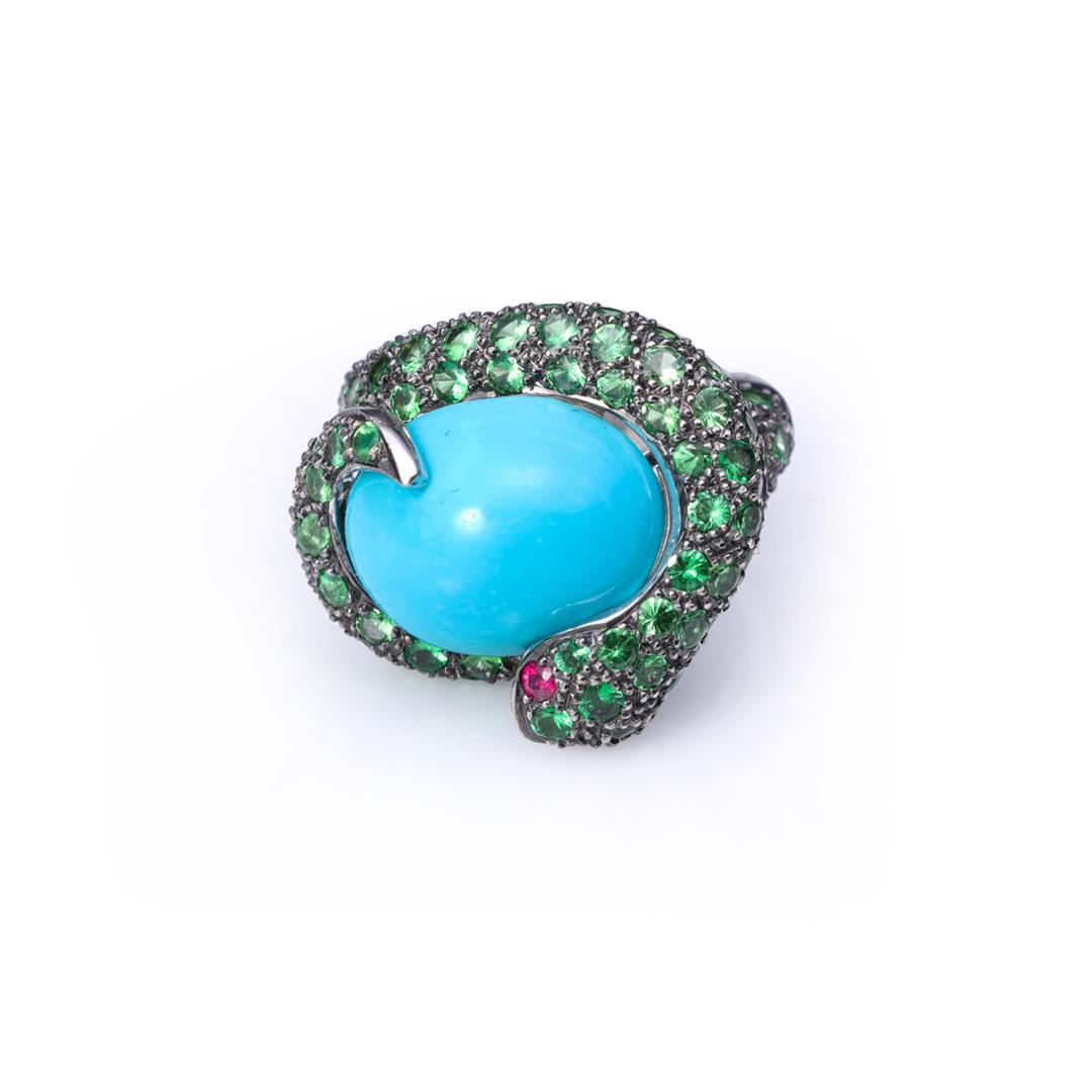 A very heavy mounted 18k white gold tsavorite garnet, ruby and turquoise ring in the form of a coiled snake wrapped around an oval turquoise cabochon; the snake well modeled with two ruby eyes and the body pave set with bright green tsavorite garnets upon