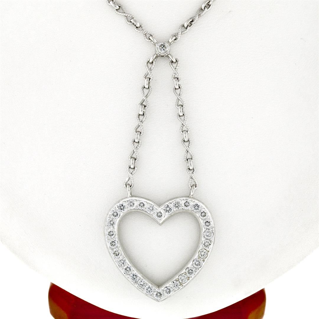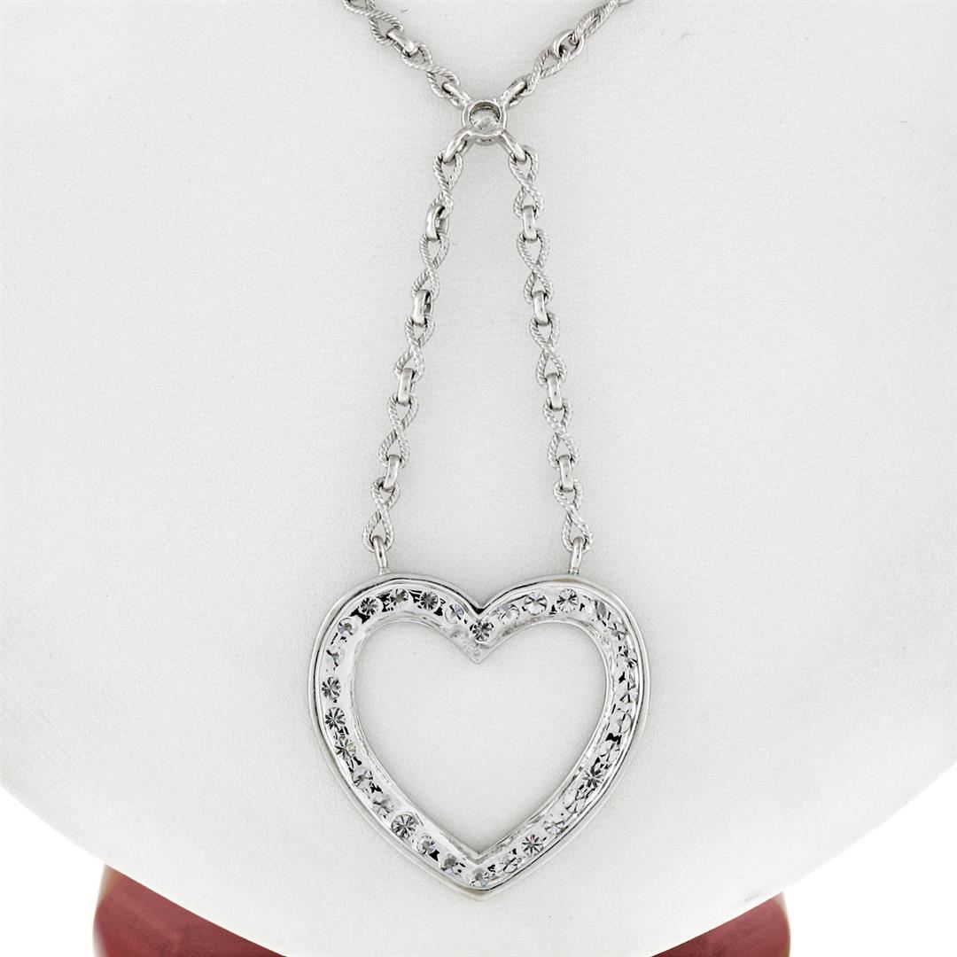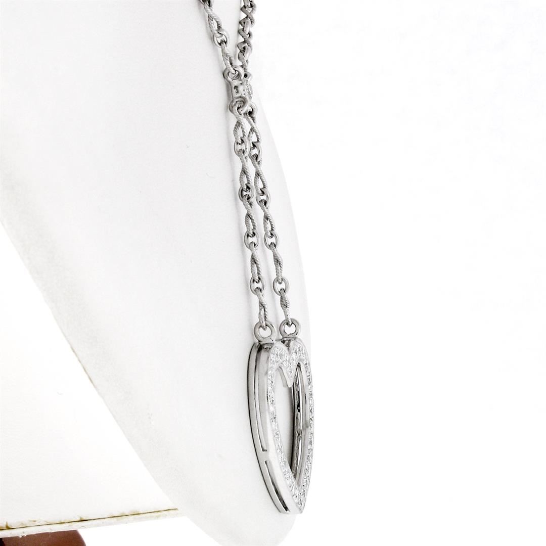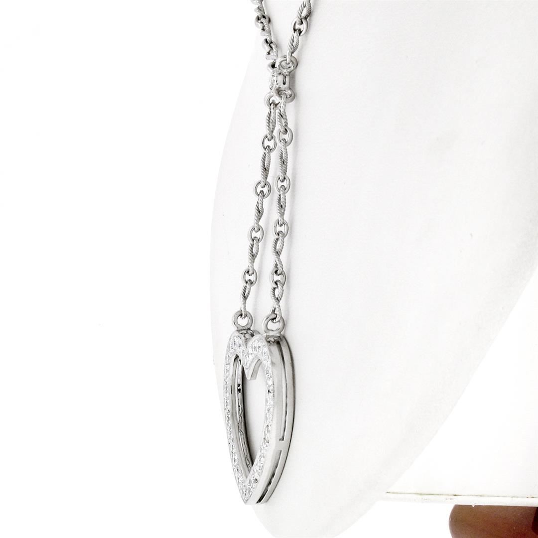 An estate solid 18k white gold heart pendant necklace. featuring 31 ideal round brilliant cut natural diamonds (E/F- VS1; 2.40ctw). 17 inch fancy infinity shaped twisted wire link chain, 19.12 grams total weight, pendant measures 29.25x30.85mm.
