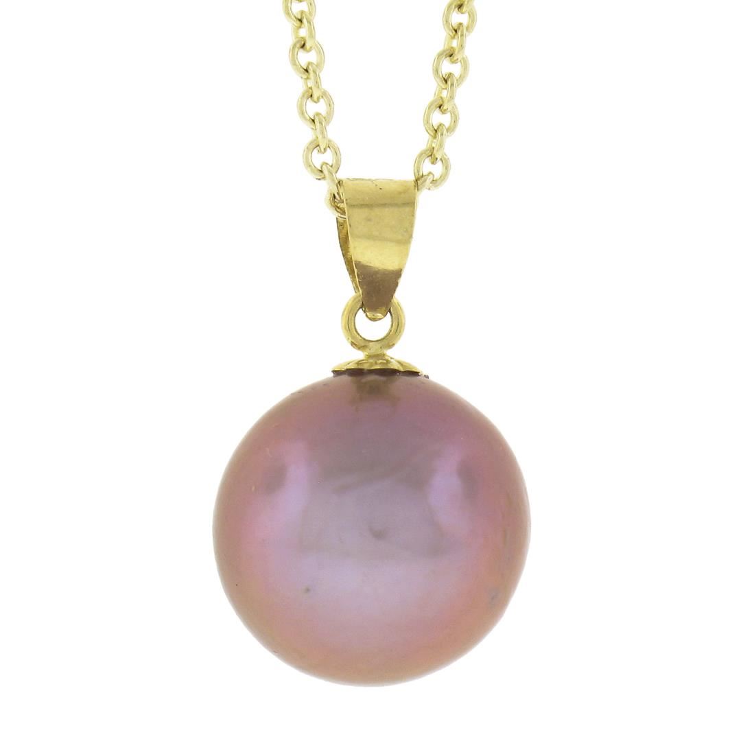 18K Yellow Gold 10.3mm Pink Pearl Solitaire Pendant 18" Cable Chain Necklace