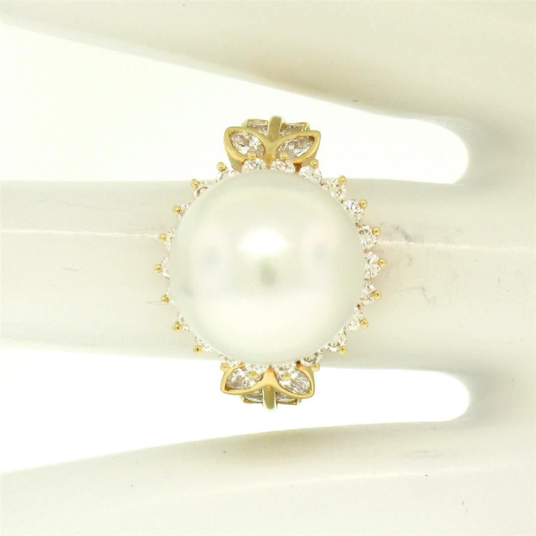 One 18K Yellow Gold LARGE 13.3mm South Sea Pearl Ring w/ 0.95ctw Round Diamond Halo. Item Details: Material: 18k Solid Yellow Gold, Weight: 11.6 Grams, Stone(s): (1) Genuine South Seas Pearl - Round Shape - White Color w/ Pink Undertones- Magnificent Luster - Nearly Perfect Surface - 13.3mm, (30) Natural Genuine Diamonds - Round Cut - Prong & Channel Set - F/G Color - VS1 Clarity - 0.65ctw (approx.), (4) Natural Genuine Diamonds - Marquise Cut - Bezel Set - F Color - VS1 Clarity - 0.30 (approx.), Total Carat Weight: 0.95 (approx.), Ring Size: 7.5 (We can custom size this ring.), Ring Width: 16mm, Ring Height: 17.15mm rise off the finger. Condition: Like New!