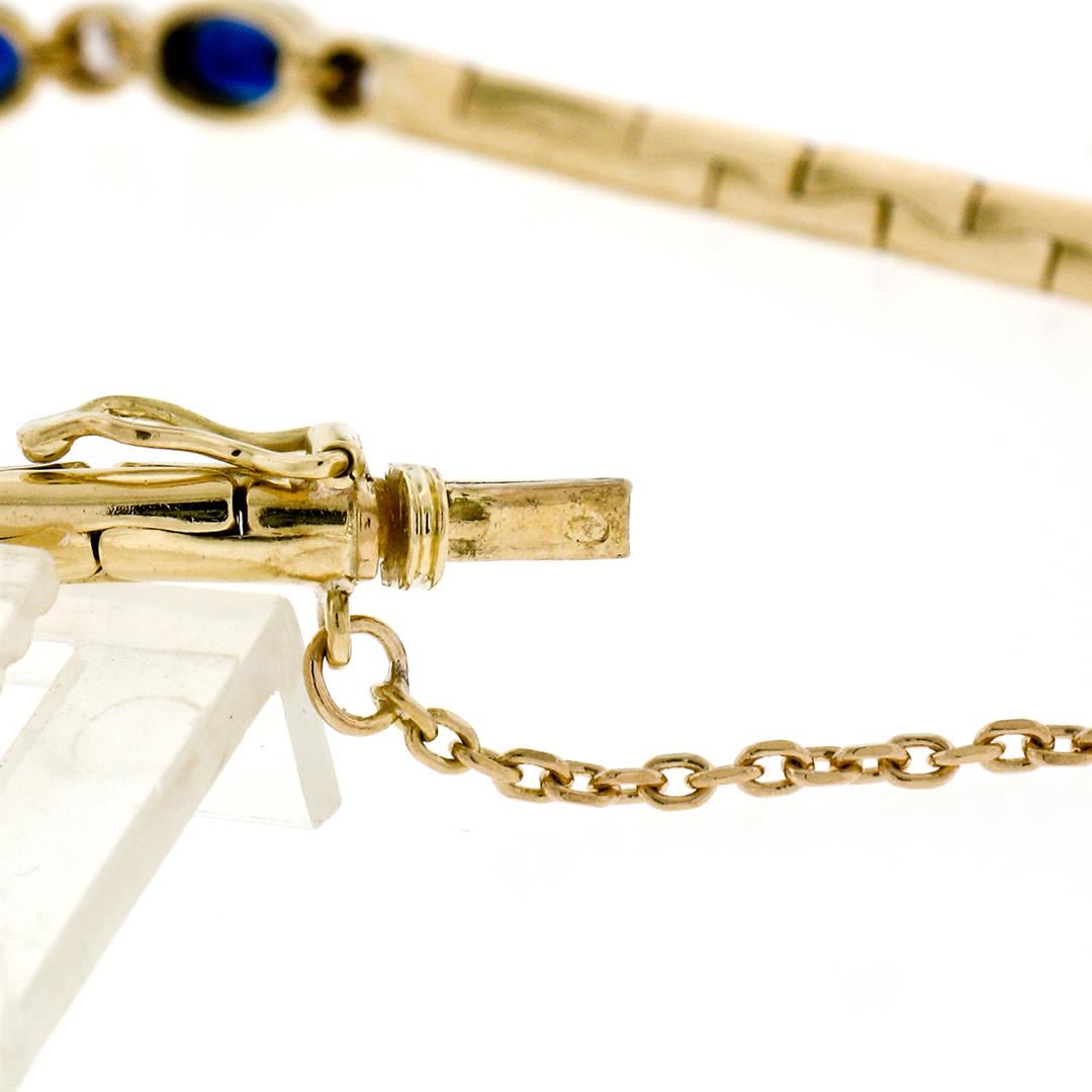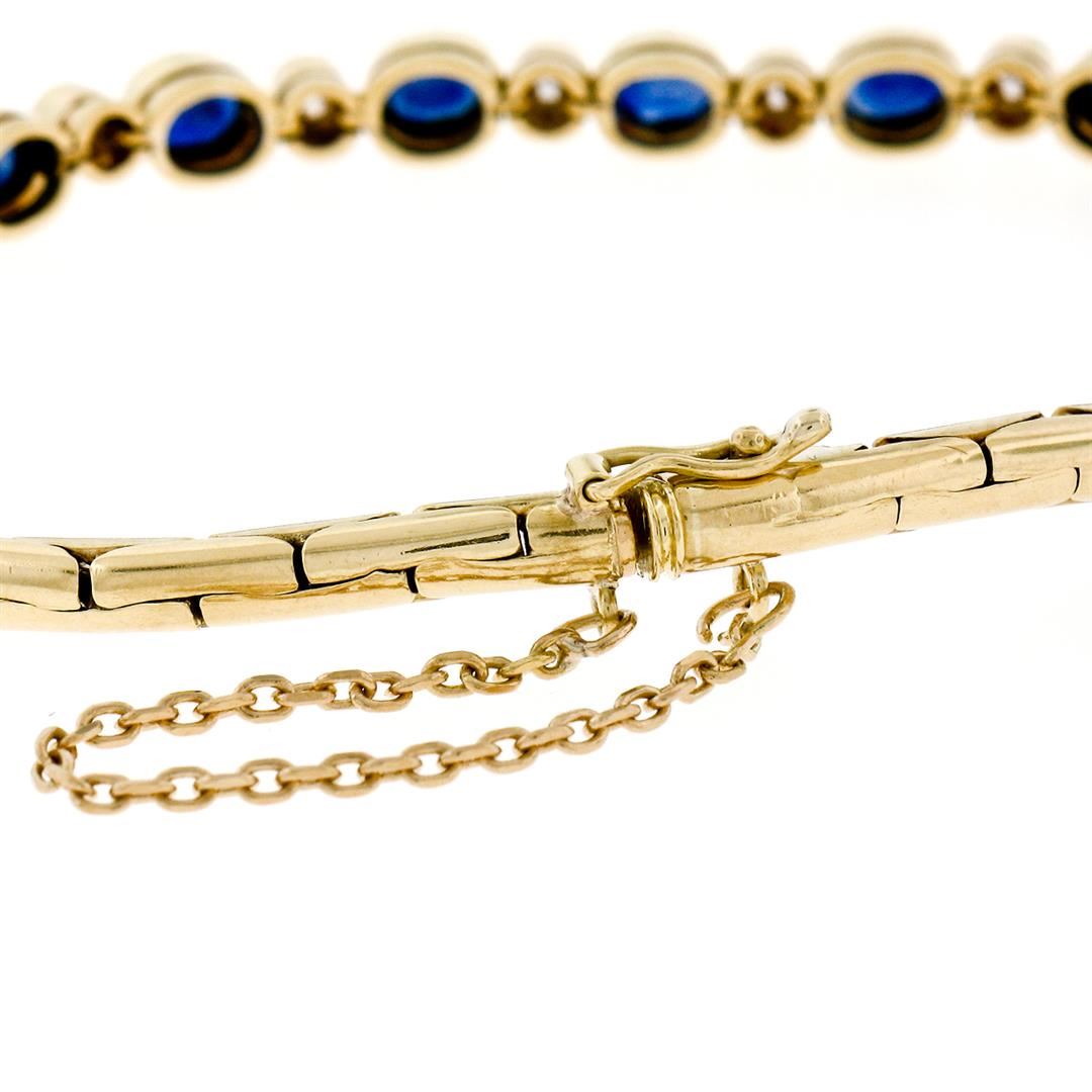 A solid 18k yellow gold bracelet, with 6 oval cut natural sapphires (2.15ctw), and 7 round brilliant cut natural diamonds (F/G- VS1/VS2; 0.45ctw). It weighs a total of 17.61 grams, measures 4.85mm wide, and measures 6.75 inches in length.